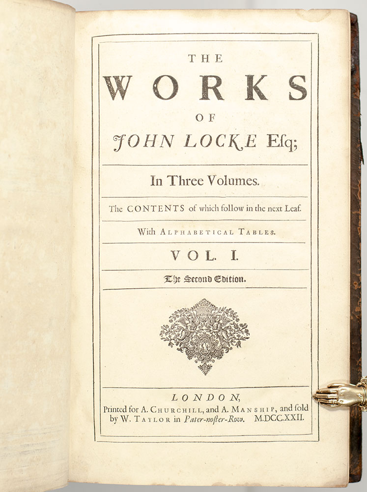 John Locke is regarded as one of the most influential of Enlightenment thinkers and the Father of Classical Liberalism. "Locke was the first to take up the challenge of Bacon and to attempt to estimate critically the certainty and the adequacy of human knowledge when confronted with God and the universe" (PMM 164). This is the first edition of the first collected edition of his work and the earliest to put his name to "Two Treatises on Government" as well as the letters on "Toleration"and "The Reasonableness of Christianity". Contents include: Volume 1: An Essay concerning Human Understanding. In Four Books; A Letter to the Right Reverend Edward Lord Bishop of Worcester, concerning some Passages relating to Mr. Locke's Essay of Human Understanding, in a late Discourse of his Lordship's in Vindication of the Trinity; Mr. Locke's Reply to the Right Reverend the Bishop of Worcester's Answer to the Letter; Mr. Locke's Reply to the Bishop of Worcester's Answer to his Second Letter. Volume 2: Some Considerations of the Consequences of the lowering of Interest, and raising the Value of Money. In a Letter send to a Member of Parliament. 1691; Short Observations on a printed Paper, entitled, For encouraging the coining SilverMoney in England, and after for keeping it here; Further Observations concerning raising the Value of Money. Wherein Mr. Lowndes's Arguments for it, in his late Report concerning An Essay for the Amendment of the Silver Coin, are particularly examind'd; Two Treatises of Government. In the Former, the false Principles and Foundation of Sir Robert Filmer, and his Followers, are detected and overthrown. The Latter is an Essay concerning the true Original, Extent, and End of Civil Government; A Letter concerning Toleration; A Second Letter concerning Toleration; A Third Letter for Toleration: To the Author of the Third Letter concerning Toleration; The Reasonableness of Christianity, as deliver'd in the Scriptures; A Vindication of The Reasonableness of Christianity, From Mr. Edwards's Reflections; A Second Vindication of the Reasonableness of Christianity. Volume 3: Some Thoughts concerning Education; A Paraphrase and Notes on the Epistles of St. Paul to the Galatians, I and II. Corinthians, Romans, and Ephesians. To which is prefix'd, An Essay for the Understanding of St. Paul's Epistles, by consulting St. Paul himself; Posthumous Works, viz. I. Of the Conduct of the Understanding. II. An Examination of P. Malebranche's Opinion of Seeing all things in God. III. A Discourse of Miracles. IV. Par of a Fourth Letter for Toleration. V. Memoirs relating to the Life of Anthony, first Earl of Shaftesbury. VI. A new Method of the Common-Place-Book written originally in French, and translated into English; Some familiar Letters between Mr. Locke and Several of his Friends.The work was published ten years after his death and is the first time his works were published as a collection.