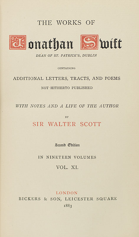 Finely bound set of the works of Jonathan Swift, with notes and a life by Sir Walter Scott, one of 750 numbered sets, this is number 330. Octavo,19 volumes, bound in three quarters morocco, gilt titles to the spine, raised bands, top edge gilt. In near fine condition. From the library of Sir Ranjitsinhji Vibhaji Jadeja, often known as Ranji, who was the ruler of the Indian princely state of Nawanagar from 1907 to 1933, as Maharaja Jam Saheb, and was a noted Test cricketer who played for the English cricket team. Sets of Swift are uncommon, especially in this condition.