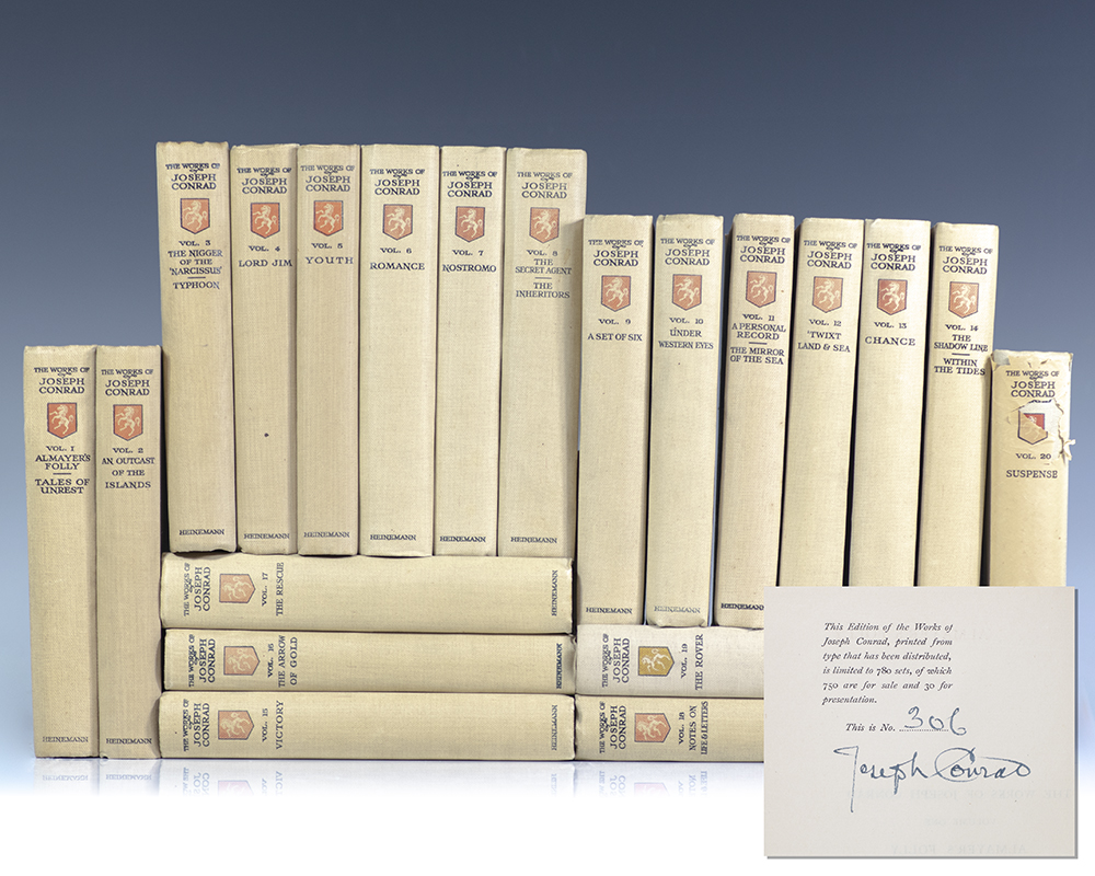 Signed limited edition of the works of Joseph Conrad, one of 780 examples, signed by Conrad on the limitation page of volume one. Octavo, 20 volumes, original cloth, top edge gilt, each volume illustrated with an engraved frontispiece. In near fine condition.