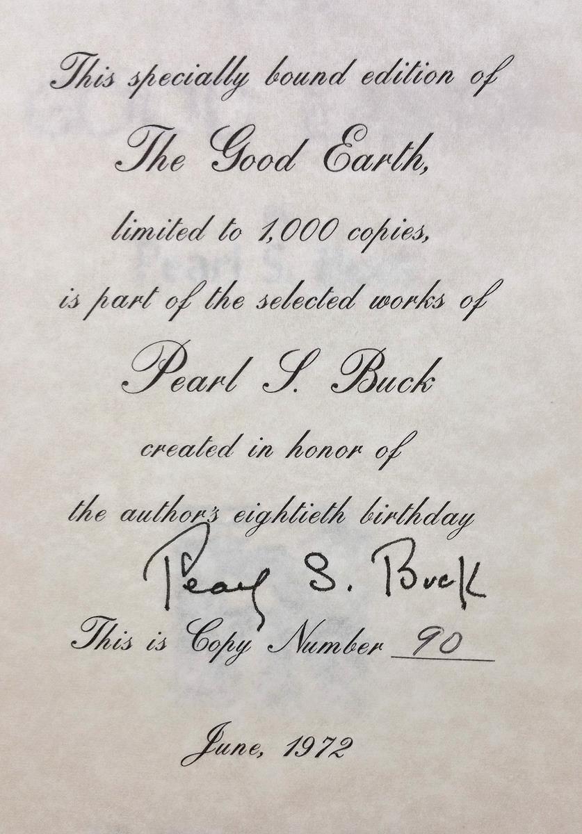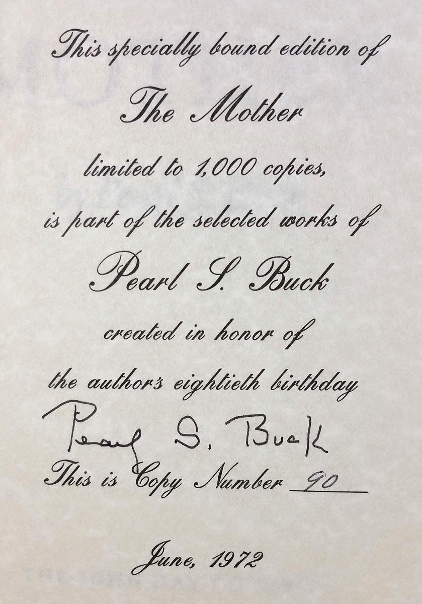 Eleven volume set published on Pearl Buck’s 80th Birthday, nine of which are signed by Pearl Buck. One of a 1,000 numbered sets. Octavo, 11 volumes, half leather, titles to the spine in gilt, top edge gilt. In near fine condition. The Exile and Fighting Angel were printed after the author’s death.