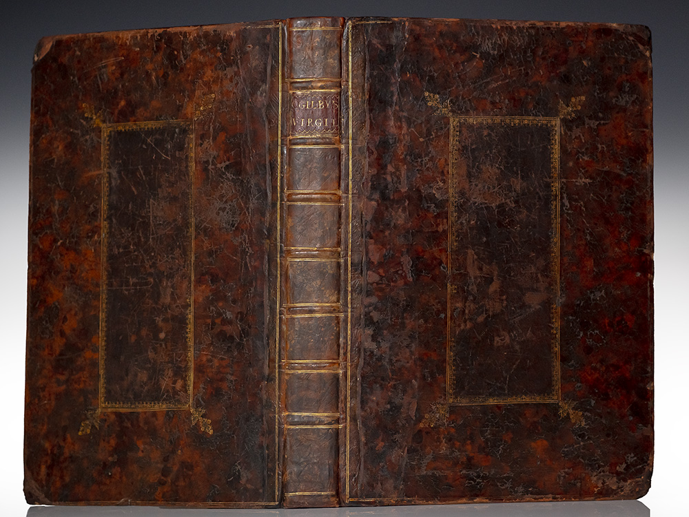 First illustrated edition of Ogilby's English translation of the works of Virgil, lavishly illustrated with 101 full-page copperplate engravings by famed engravers Pierre Lombart and Wenceslaus Hollar. Folio, bound in full contemporary paneled mottled calf with gilt ruling to the spine in six compartments within raised bands, rebacked to style preserving original morocco spine label lettered in gilt, gilt ruling, scrolling and cornerpieces to the front and rear panels, engraved portrait frontispiece by W. Faithhorne after P. Lely, additional title engraved by P. Lombard after F. Cleyn, title printed in red and black, double-page map engraved by W. Hollar, 101 full-page illustrations engraved by W. Hollar and P. Lombard after F. Cleyn, and with engraved initials, headpieces, and tailpieces. Wing V-610. In very good condition, armorial bookplate to the pastedown. A very nice example of this landmark work in 17th-century English printing.