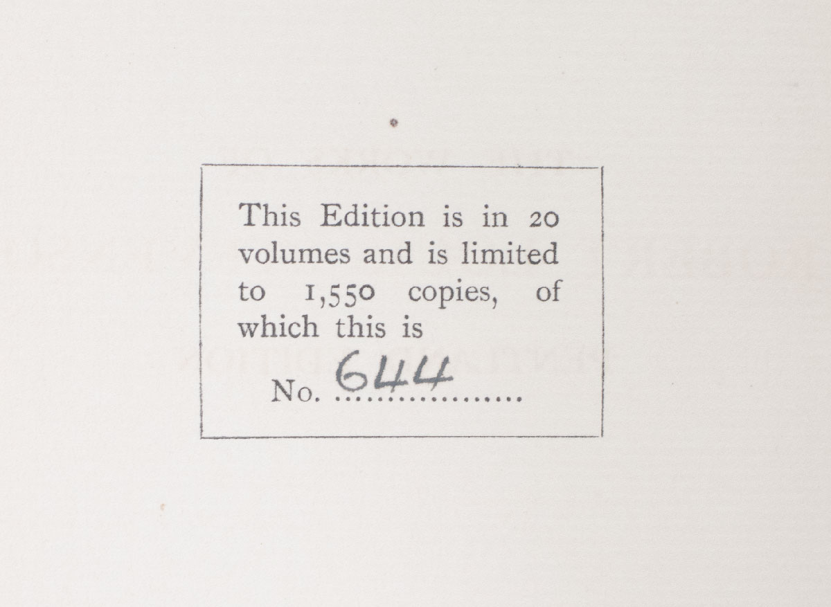 The Pentland edition, one of 1,550 sets. Octavo, 20 volumes, bound in three quarters morocco by Sotheran & Co., gilt titles and tooling to the spine, raised bands, frontispieces, tissue-guards, titles printed in red and black. In fine condition. With bibliographical notes by Edmund Gosse. An exceptional set.