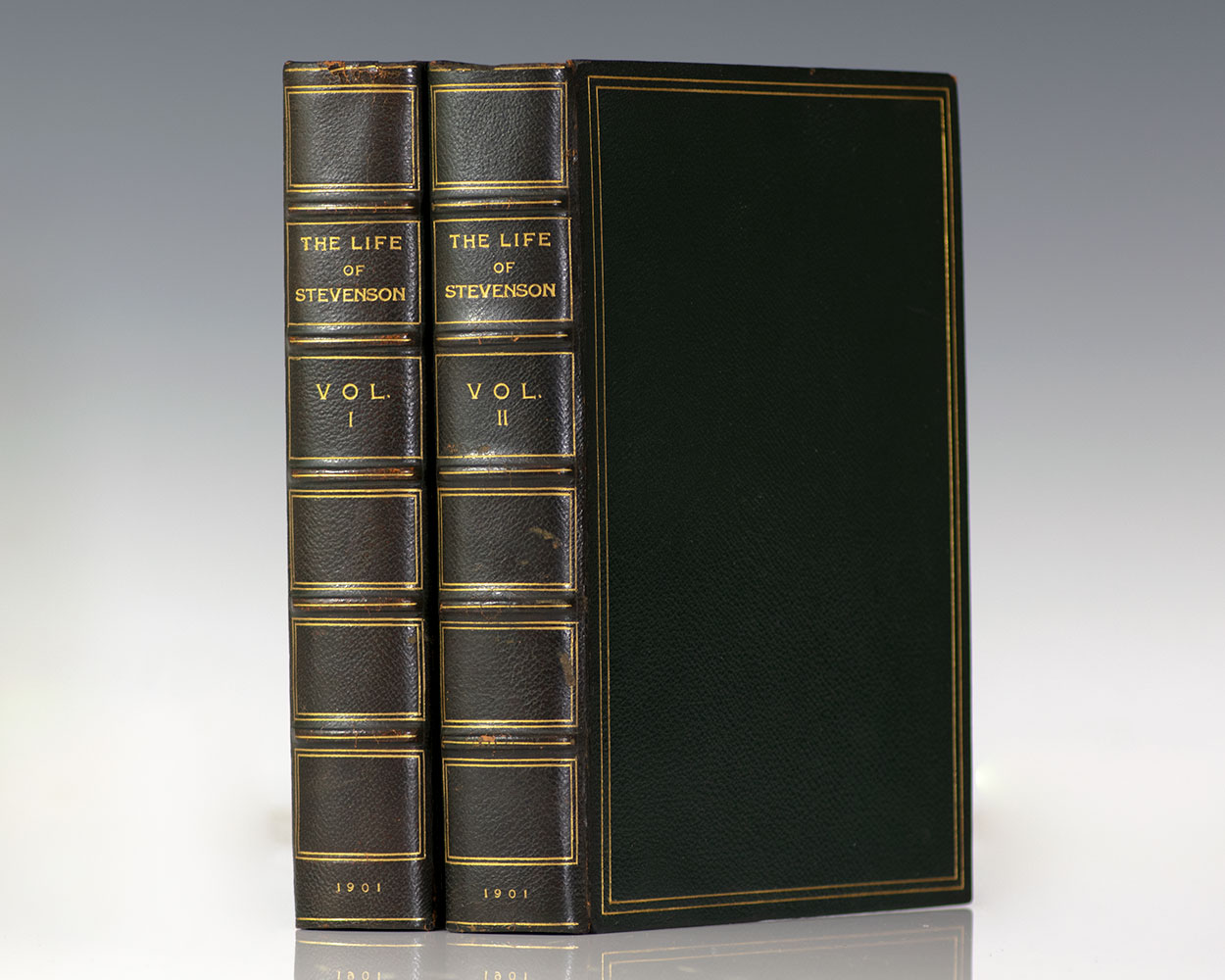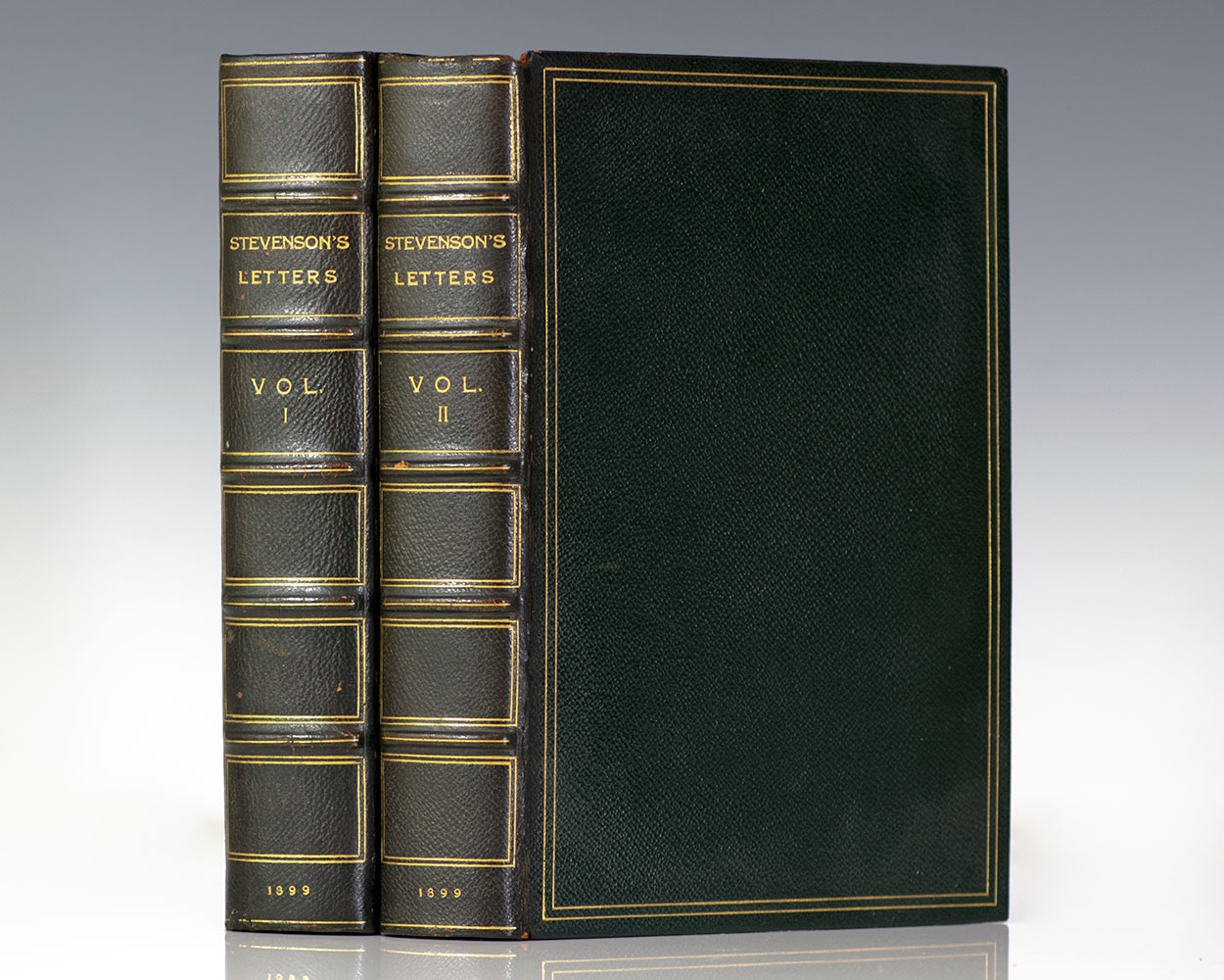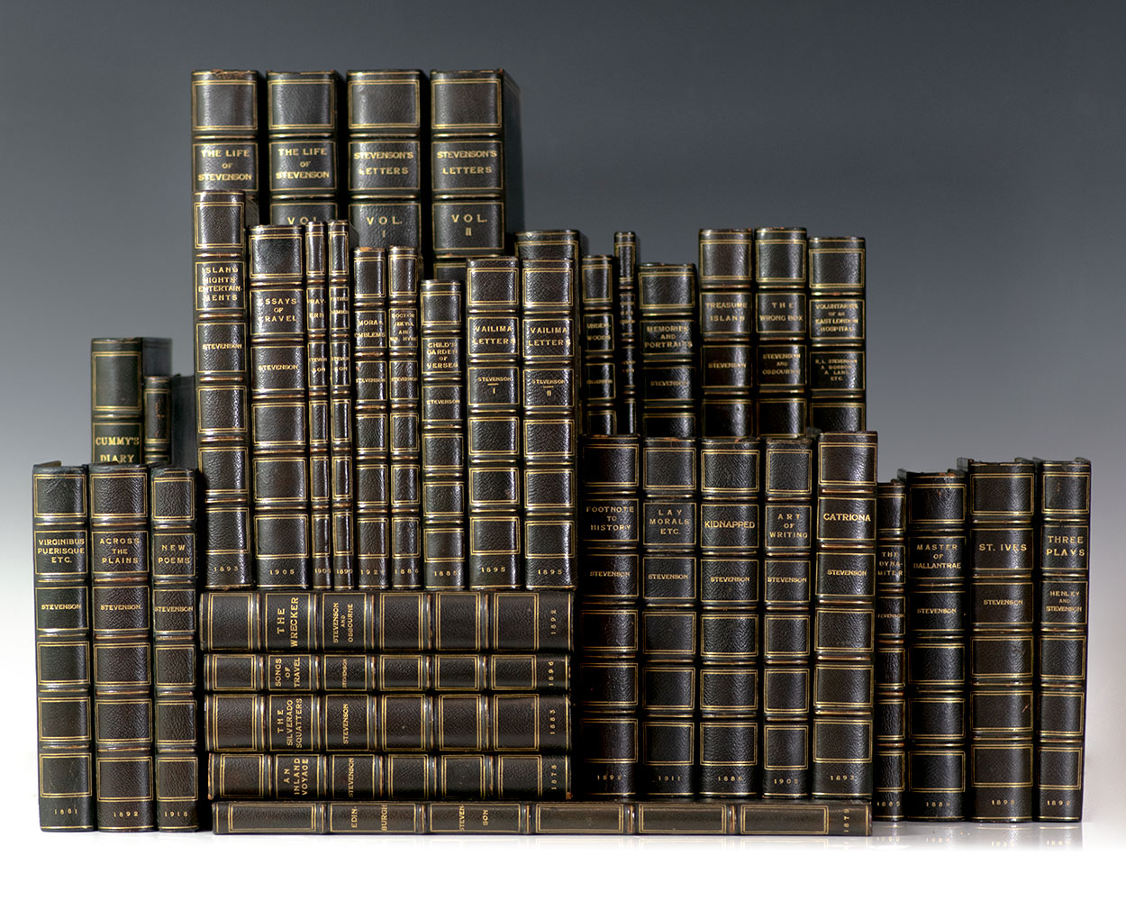 An extensive collection of forty-nine works by Robert Louis Stevenson, publishing date 1878-1926 to include the Letters of Robert Louis Stevenson, Sidney Colvin, Methuen 1899 and The Life of Robert Louis Stevenson by Graham Balfour 1901. 2 vols. Stevenson's Baby Book, John Howell, San Francisco 1922. Cummy's Diary, A Diary kept by Robert Louis Stevenson's nurse, Alison Cunningham 1863. Chatto & Windus 1926. Ltd 734/780; Edinburgh Picturesque Notes by Robert Louis Stevenson with etchings by A Brunet-Debaines. Seeley Jackson and Halliday 1879. Octavo, 49 volumes, bound in dark green morocco, title titles to the spine, raised bands, gilt top edge, original covers are tipped at the back of each book. In near fine condition. A nice set.