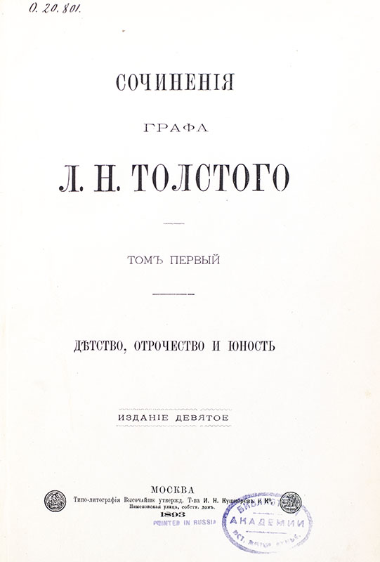 Rare complete set in Russian of the works of Leo Tolstoy, Prince Johan's copy. Octavo, 14 volumes, twelve portrait frontispieces and six plates, bound in three quarters morocco with each binding signed by Nikolai Trukhachev, principal binder for the Konstantinovich family from 1901 to 1915, gilt titles to the spine, raised bands, marbled endpapers. Prince Johan, was the eldest son of Grand Duke Konstantin Konstantinovich of Russia by his wife, Yelizaveta Mavrikievna, née Princess Elisabeth of Saxe-Altenburg. He was described by contemporaries as a gentle, religious person, nicknamed "Ioannchik" by his relatives. He was born as a Grand Duke of Russia with the style Imperial Highness, but at the age of 9 days, a Ukaz of his cousin Emperor Alexander III of Russia stripped him of that title, as the Ukaz amended the House Law by limiting the grand-ducal title to grandsons of a reigning emperor. As a result, he received the title Prince of the Imperial Blood (Prince of Russia) with the style Highness. He married Princess Helen of Serbia on 2 September 1911, and Helen took the name Princess Yelena Petrovna of Russia. They had a son, Prince Vsevolod Ivanovich (20 January 1914 – 18 June 1973), and a daughter, Princess Yekaterina Ivanovna (12 July 1915 – 13 March 2007), who was the last member of the Imperial Family to be born before the fall of the dynasty, and was ultimately to become the last surviving uncontested dynasty of the Imperial House of Russia. Academy for the History of Material Culture (stamps, press-mark O.20.801 ) Printed in Russia (small import stamp on each title). From the library of Eden Martin, a prominent American collector. Most rare and desirable, especially with noted provenance.