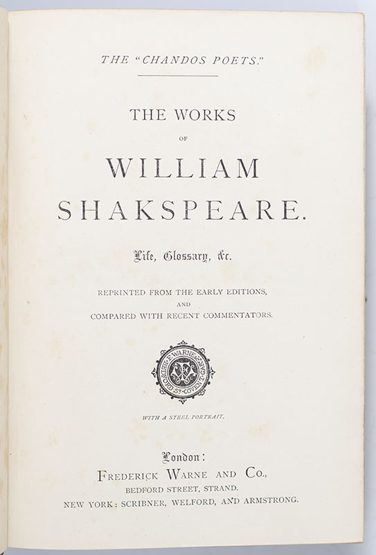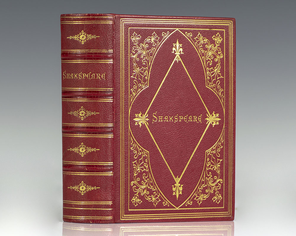 The "Chandos Poets" edition of Shakespeare's collected works. Octavo, bound in full morocco with gilt titles and tooling to the spin in 5 compartments within raised bands, elaborate gilt ruling and decoration to the front and read panel, inner dentelles, all edges gilt with a fore-edge painting displaying portraits of William Shakespeare and Her Majesty Queen Elizabeth, tissue-guarded frontispiece portrait of Shakespeare. In near fine condition.