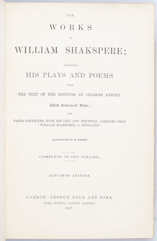 Finely bound example of this collection of Shakespeare's plays and poems with a fore-edge painting. Octavo, bound in full red morocco with gilt titles and elaborate gilt tooling to the spine, elaborate gilt ruling and and fleuron cornerpieces to the front and rear panels, gilt turn-ins and inner dentelles, marbled endpapers, illustrated by W. Harvey. With a fore-edge painting of a portrait of Shakespeare with a scene from a Midsummer Night's Dream. In near fine condition. Embossed stamp.
