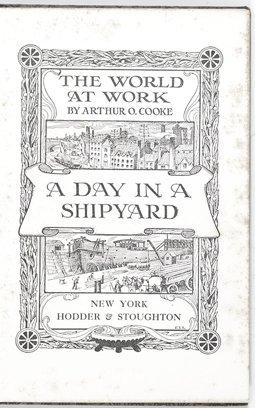 First edition of Arthur O. Cooke's The World at Work: A Day in a Shipyard. Small octavo, original illustrated boards with pictorial pastedown, pictorial endpapers, illustrated with engravings from photographs, three full-page colored plates including frontispiece, mechanical charts. In near fine condition. Rare.