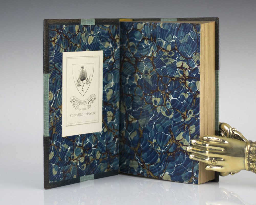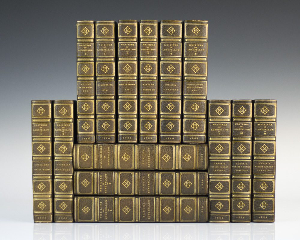 Octavo, three-quarters leather, 14 volumes. Top edge gilt, gilt titles and tooling to the spine, gilt ruled to the front and rear panel, marbled endpapers. One of 500 numbered copies. This is set number 144. It also includes the three volume Final Memorials of Longfellow by Ticknor and Company published in 1887. All volumes are numbered 144 of 300 copies. Each volume contains the bookplate of noted American poet and publisher Scofield Thayer, best known for his art collection, which is housed in the Metropolitan Museum of Art. In near fine condition.