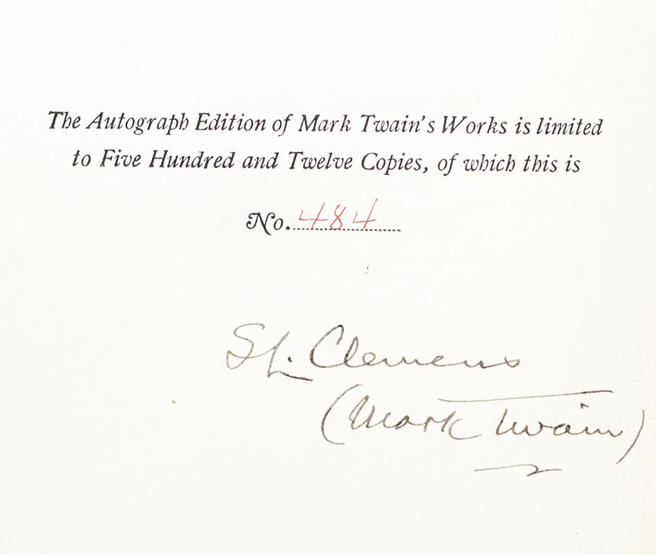 The autograph edition of Twain's selected writings. Octavo, 25 volumes bound in full crushed green morocco with gilt titles and elaborate gilt tooling to the spine in six compartments within raised gilt bands, elaborate gilt ruling and cornerpeices to the panels featuring central floral morocco inlays, gilt turn-ins and inner dentelles, red morrocco doublures with floral morocco inlays, blue watered silk endleaves and marbled endpapers, tissue-guarded frontispieces and pictorial title pages. One of five hundred and twelve numbered copies signed by Twain on the limitation leaf, this is number 484. Additionally signed by on the limitation leaf of Vol. 10 by Charles Dudley Warner, Twain's collaborator on The Gilded Age, and by Branden Matthews at the conclusion of his introduction in Vol. 1. Volumes 23, 24, and 25, issued separately by Plimpton Press and Harper and Brothers, respectively, "as an accommodation to purchasers of earlier volumes with a view to making their sets uniform" (BAL 3456). In very good condition. A very nice set, desirable in full morocco.