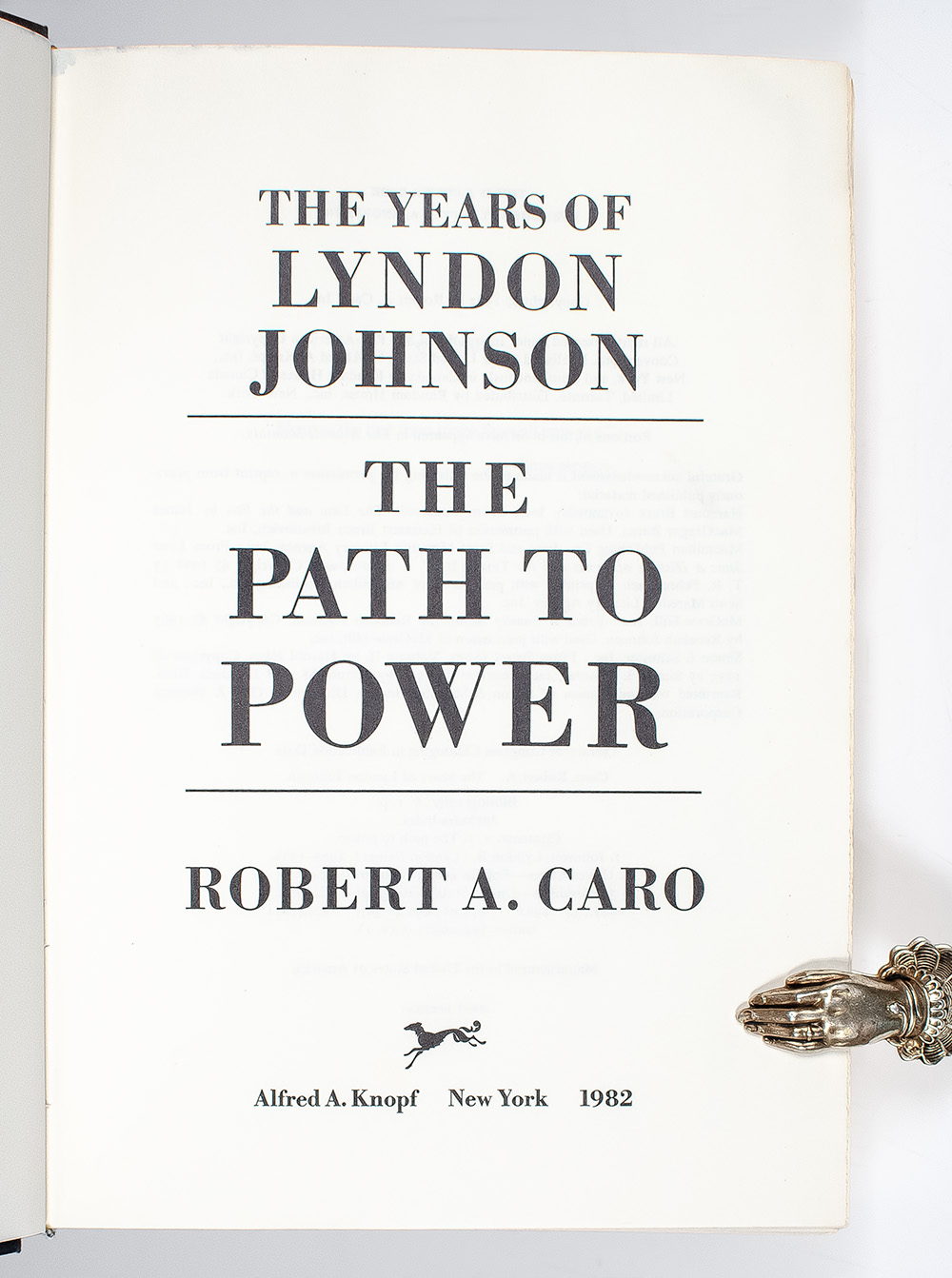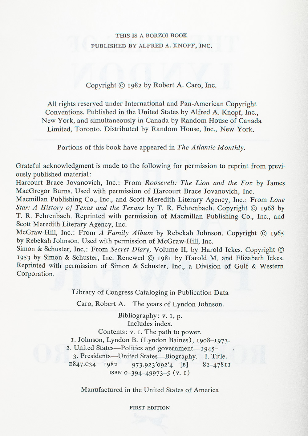 First editions of each volume in Robert A Caro's ground-breaking biography of President Lyndon Johnson, each signed or inscribed by Caro. Octavo, original publisher's gilt-lettered cloth, illustrated with numerous photographs and maps. The Path To Power [1982] is signed by the author on the front free endpaper, "Robert A. Caro." Means of Ascent [1990] is signed by Robert A Caro on the front free endpaper. Master of the Senate [2002] is a presentation copy, inscribed by the author on the half-title page, "For Bill Curtis Robert A Caro." The Passage of Power is signed by the author on the title page. Each are near fine to fine in very good to fine dust jackets. Jacket designs by R.D. Scudellari. Spine of The Passage of Power jacket photograph of Johnson by Yousuf Karsh. With a souvenir 1969 Official President Richard Nixon Inaugural Portrait Folio. A very sharp set.