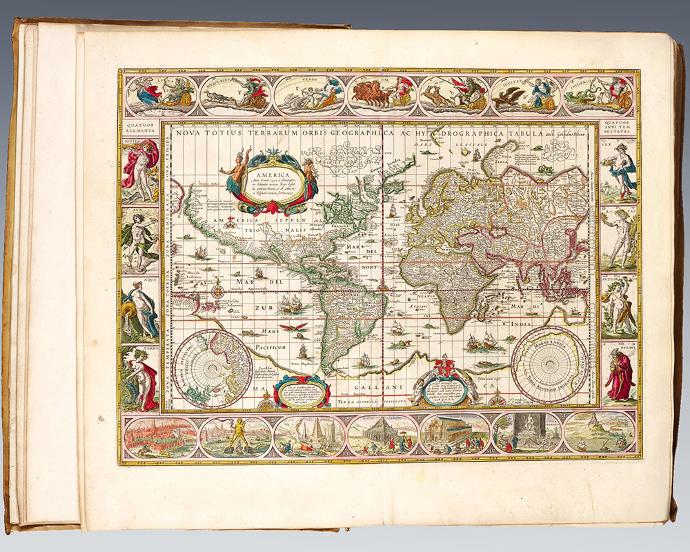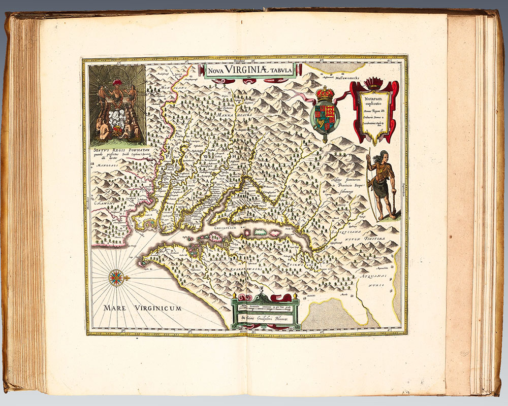 A fine French-text copy in a presentation binding. Folio, 4 volumes, contemporary Dutch vellum likely from the Blaeu workshop with gilt tooling to the spine in eight compartments within gilt bands, central gilt arabesques and fleuron corner pieces within double gilt ruling to the front and rear panels, all edges gilt. Gilt presentation inscription to the front panel of vol. I dated July 3, 1646 dedicating the set to Omer Talon, avocat-général to the French Parliament with the compliments of François du Monstier, rector of the University of Paris. Illustrated with 335 magnificent hand-colored engraved maps of the world and four continents including, in particular, sixty devoted to Great Britain (Volume IV), the map of the environs of Frankfurt (Volume I), a fine map of China and Japan (Volume III), and a series of thirteen maps of America (Volume III) that includes early and important maps of New England and the Chesapeake Bay. The set is comprised of: Volume I: Theatrum Orbis Terrarum Sive Atlas Novus; in Quo Tabulae et Descriptiones omnium Regionum, Editae a Guiljel: et Joanne Blaeu. [Amsterdami: Apud Guiljelmum et Johannem Blaeu, 1643]. Folio, 120 engraved maps in two parts. Part I: World map, plus 83 maps of Germany, Scandinavia, the Arctic and eastern Europe, several oversized and folding. Part II: 36 maps of the Lowlands. Volume II: Le Theatre Du Monde, ou Novvel Altas, Mis en lumiere par Guillaume & Jean Blaeu. Second Partie [A Amsterdam: Chez Jean Blaeu, 1643-1644]. Folio, contains 92 engraved maps in two parts (one folding): Part I: 48 maps of France; Part II: 14 maps of Spain and Portugal, 12 maps of Asia, 5 maps of Africa, 13 maps of America, including the appendix of the British Isles, map number 15 entitled "Le Duche de Mantove" on recto of leaf and "Mantua Ducatus" on map, without leaf 22 as listed in Van der Krogt. Volume III: Le Theatre Du Monde, ou Novvel Atlas, Mis en lumiere par Guillaume & Jean Blaeu. Troiseme Partie [A Amsterdam: Chez Jean Blaeu, 1643]. Folio, contains 66 engraved maps: 58 maps of Italy and 4 maps of Greece, with maps 2 and 3 supplied from another copy. Volume IV: Le Theatre Du Monde, ou Novvel Altas, Mis en lumiere par Guillaume & Jean Blaeu. Quatriesme Partie. [Amsterdami: Apud Johannem Blaeu, 1645]. Folio, contains 57 engraved maps detailing the British Isles with the maps "Britannia prout divisa" and "Anglia Regnum" supplied. Lacking the map of Wales. [Van der Krogt 2:212.1F, 2:212.2F, 2:212.3F,  and 2:211.3C; Koeman BL 42A]. In near fine condition. Exceptionally clean internally with some maps numbered in a contemporary hand. Armorial bookplates. Exceptionally rare and desirable. Containing some of the most beautiful maps ever produced during the golden age of cartography.