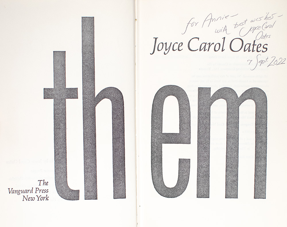 "A man on his way to death cannot be helped": First Edition of Them; Inscribed by Joyce Carol Oates to Fellow Writer Annie Dillard