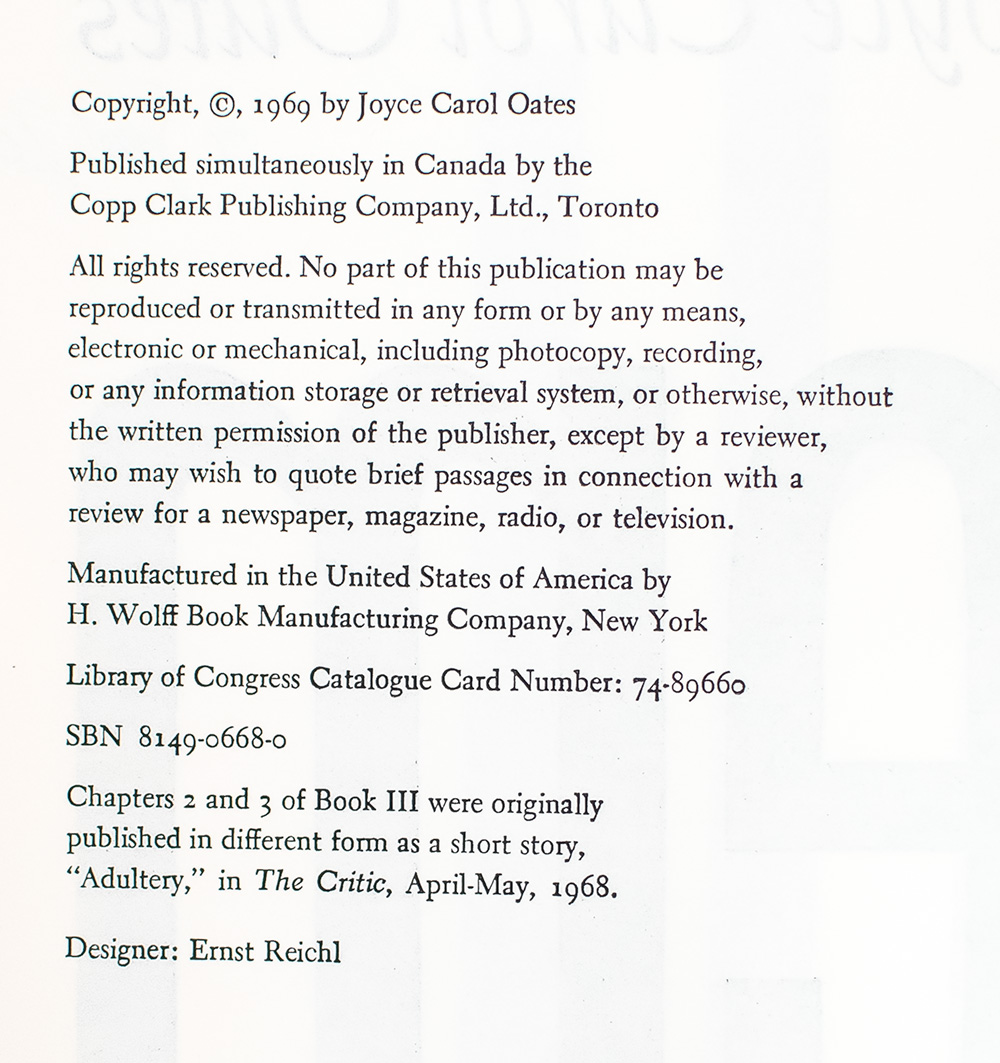 First edition of the third in Oates' Wonderland Quartet and winner of the National Book Award. Octavo, original cloth. Association copy, inscribed by the author on the title page, "For Annie - with best wishes - Joyce Carol Oates 7 Sept. 2022." The recipient, fellow author Annie Dillard has published works of poetry, essays, prose, and literary criticism, as well as two novels and one memoir. Her 1974 work Pilgrim at Tinker Creek won the 1975 Pulitzer Prize for General Nonfiction and her books have been translated into at least ten languages. Near fine in a near fine dust jacket. Housed in a cloth chemise and half morocco gilt slipcase. An exceptional association.