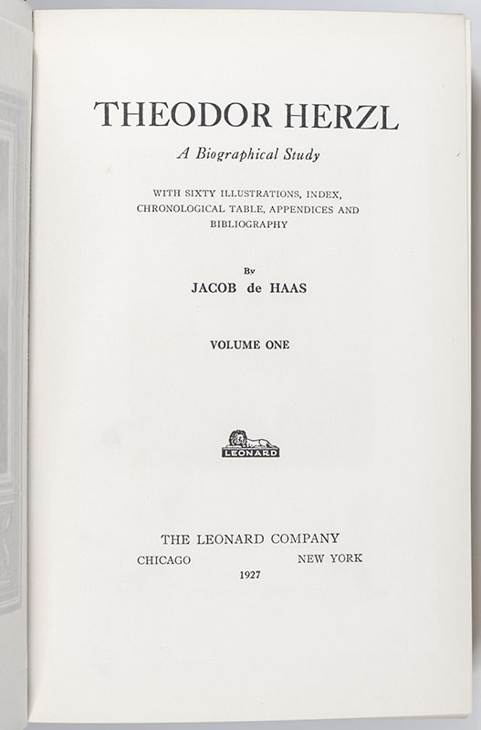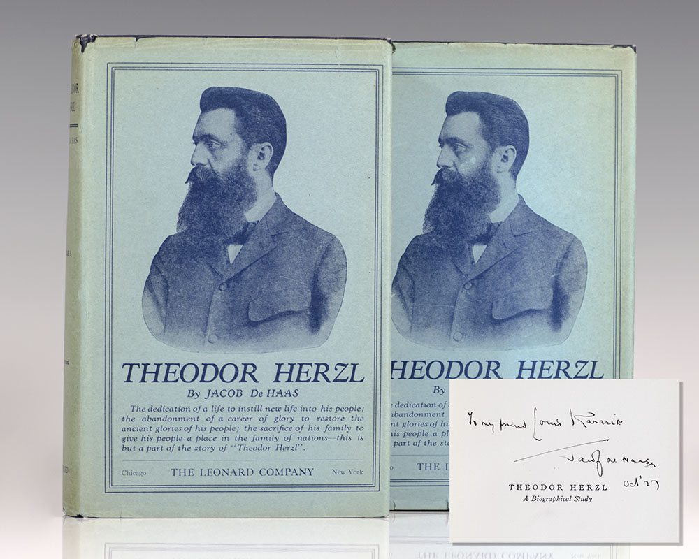 First edition of this Herzl biography by the British-born Jewish journalist and an early leader of the Zionist movement in the United States. Octavo, 2 volumes, original cloth, top edge gilt, pictorial endpapers. Presentation copy, inscribed by the author in the year of publication on the half-title page, "To my friend Louis Karasik Jacob de Haas Oct '27." Fine in very good to near fine dust jackets. With sixty illustrations, index, chronological table, appendices and bibliography. Rare and desirable signed by de Haas.