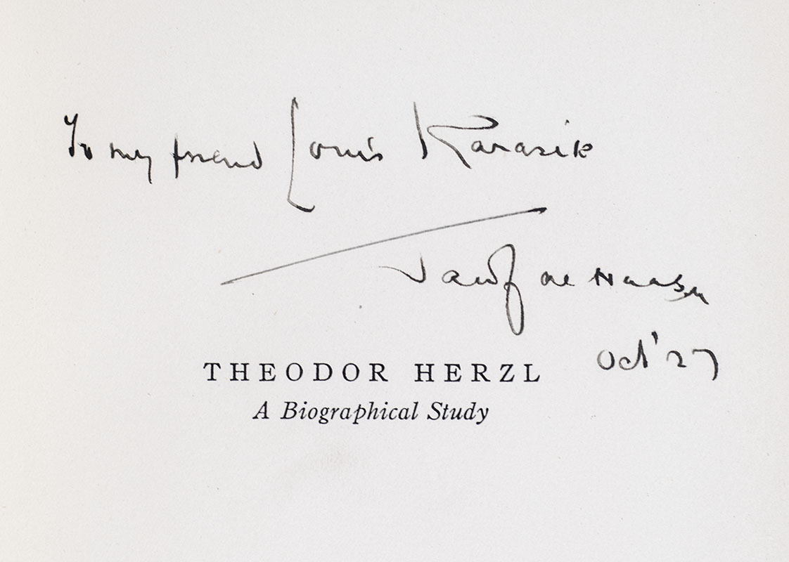"If it should occur that men of other creeds and different nationalities come to live amongst us, we should accord them honorable protection and equality before the law": First Edition of De Haas' Theodor Herzl: A Biographical Study; Inscribed by Him