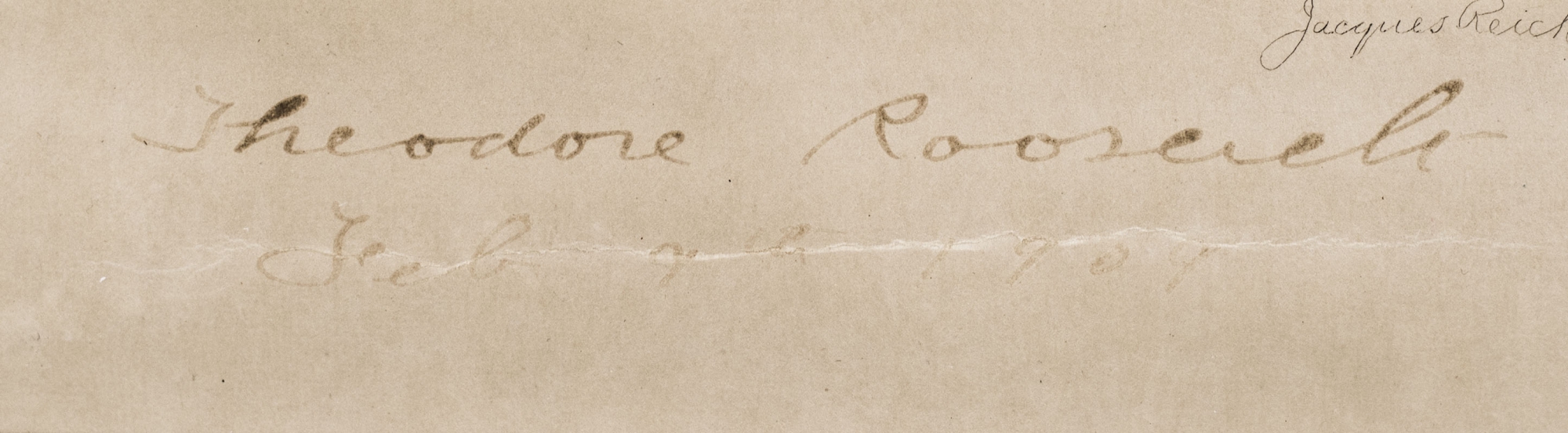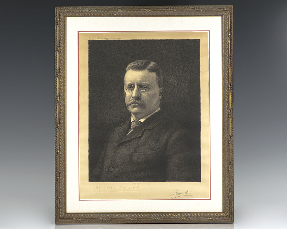 Etching of Theodore Roosevelt by Jacques Reich, signed as president, "Theodore Roosevelt, Feb. 9th 1909." Also signed by the artist, "Jacques Reich." Affixed to a same-size board, with the reverse bearing a label from the Arthur H. Hahlo Co., identifying the piece as a limited edition autographed artist's proof. In near fine condition. Double matted and framed. The entire piece measures 21.5 inches by 17.5 inches.