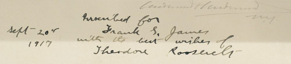 Large framed signed photograph of Theodore Roosevelt sitting outside Sagamore Hill, the family home in Oyster Bay, New York. Inscribed by him, “Inscribed for Frank S. James with the best wishes of Theodore Roosevelt, September 20th 1917.” Toned silver dry-plate photograph, signed in pencil below by the photograph studio. Matted and framed. The photograph measures 8.5 inches by 11.5 inches. The entire piece measures 14 inches by 17 inches.