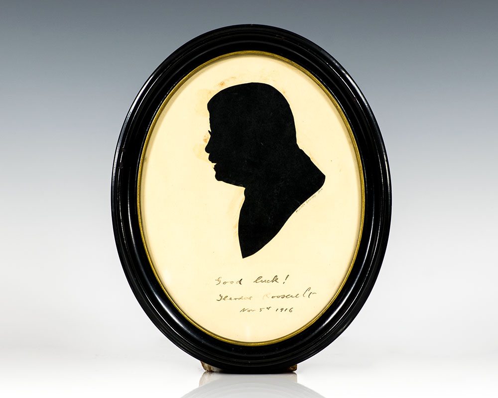 Hand-cut silhouette portrait of Theodore Roosevelt in profile, affixed to an oval signed on the mount, "Good luck! Theodore Roosevelt, Nov. 5th 1916." Signed below the silhouette by the artist, "Belinda Daniels, 1916." Framed and in fine condition, with some light staining around the silhouette. The entire piece measures 6.5 inches by 8.5 inches.