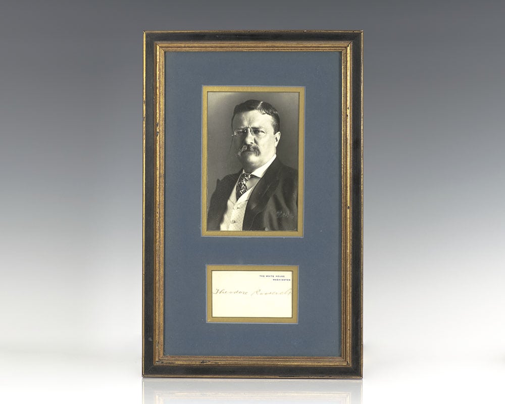 Rare White House Card signed by President Theodore Roosevelt. Double matted and framed with an original photograph of Roosevelt by Pach Brothers. The entire piece measures 10.75 inches by 16.75 inches. An attractive piece.