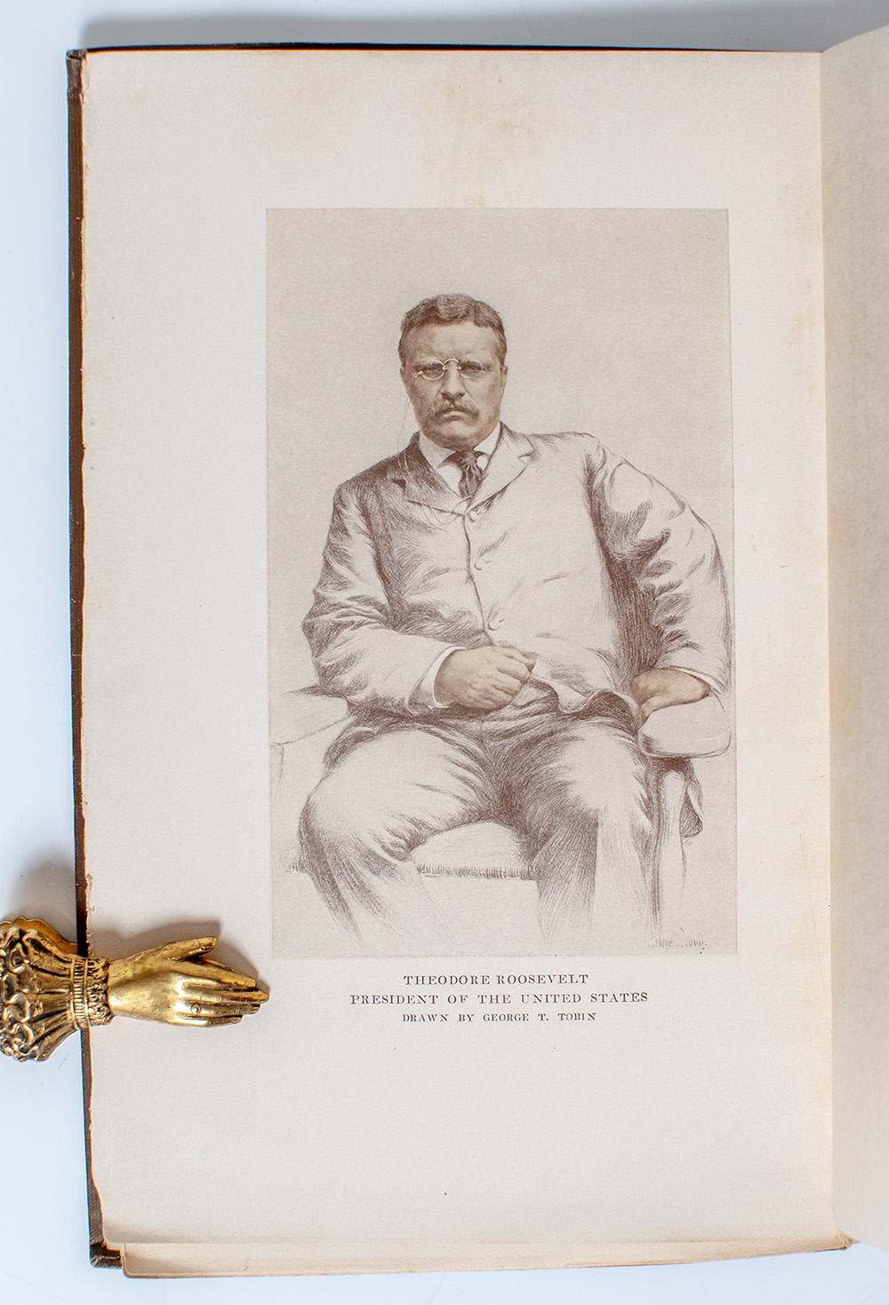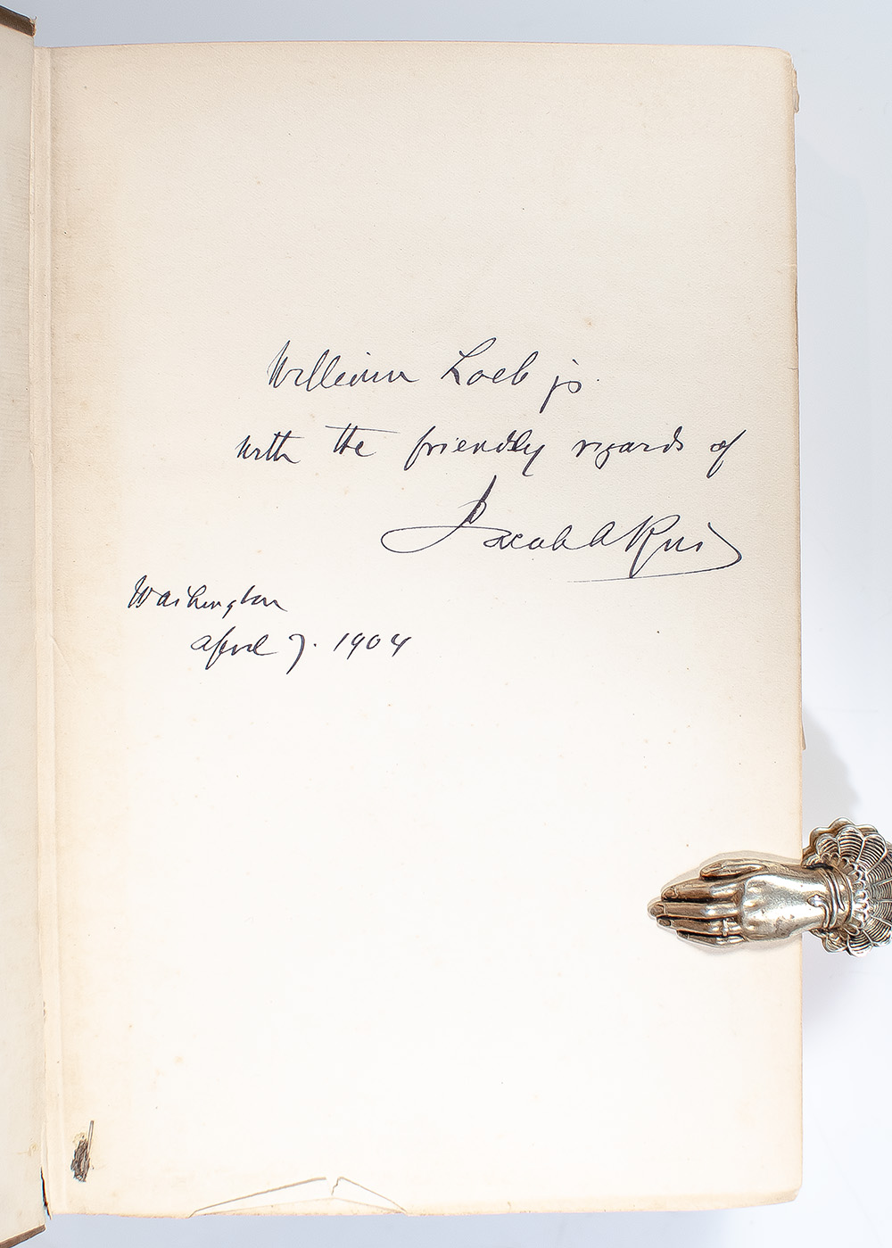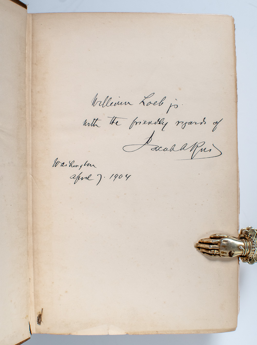 First edition of Riis’s campaign biography of President Roosevelt. Octavo, original publisher's cloth with gilt titles to the spine, gilt titles and decoration to the front panel, beveled edges, top edge gilt, tissue-guarded frontispiece of Theodore Roosevelt President of the United States drawn by George T. Tobin, illustrated with seventeen plates of black and white photographs. Association copy, inscribed by the author on the front free endpaper, "William Loeb Jr. with the friendly regards of Jacob A. Riis Washington April 7 1904." The recipient, William Loeb Jr., served as assistant secretary to the President under Theodore Roosevelt from 1901-1903 and then succeeded George B. Cortelyou as Secretary to the President in 1903, where he remained the Roosevelt's right-hand-man for the rest of his time in office. In very good condition. Rare and desirable signed and inscribed.