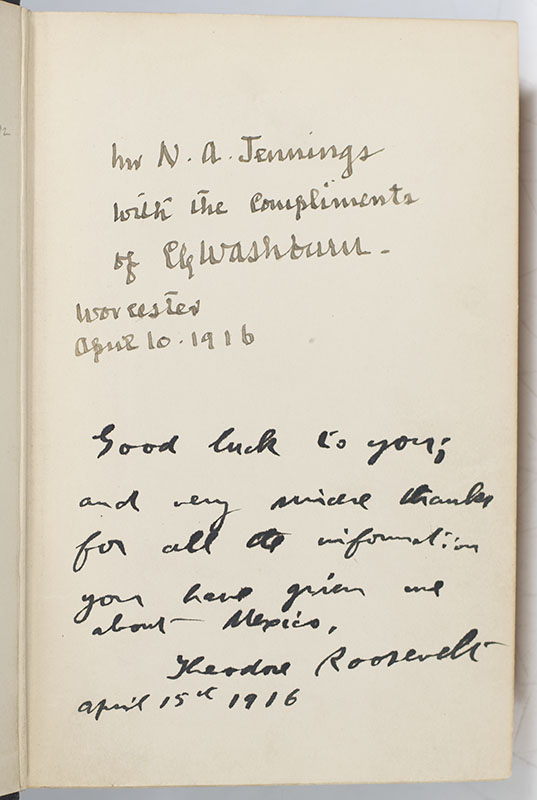 First edition of Washburn's account of Roosevelt's political career. Octavo, original cloth. Presentation copy, inscribed by both the author and subject Theodore Roosevelt on the front free endpaper, "Mr N. A. Jennings with the compliments of C. Washburn Worcester April 10, 1916." Roosevelt's inscription underneath reads. "Good luck to you; and very sincere thanks for all the information you have given me about Mexico. Theodore Roosevelt April 15th 1916. " In near fine condition. An exceptional inscription.