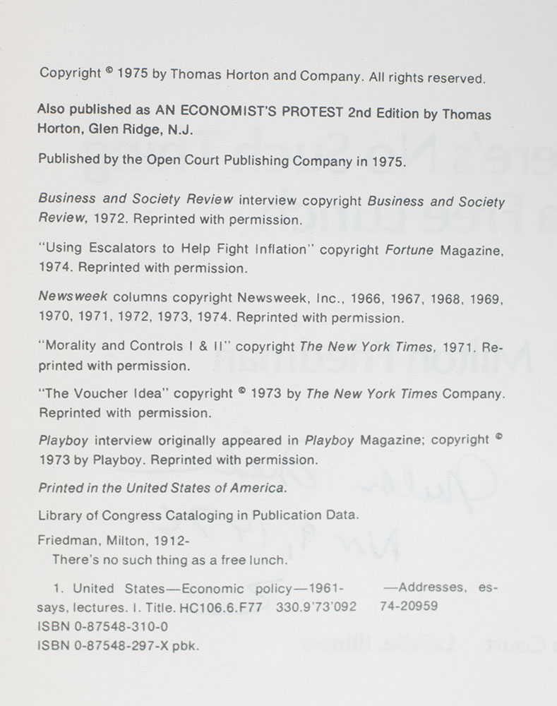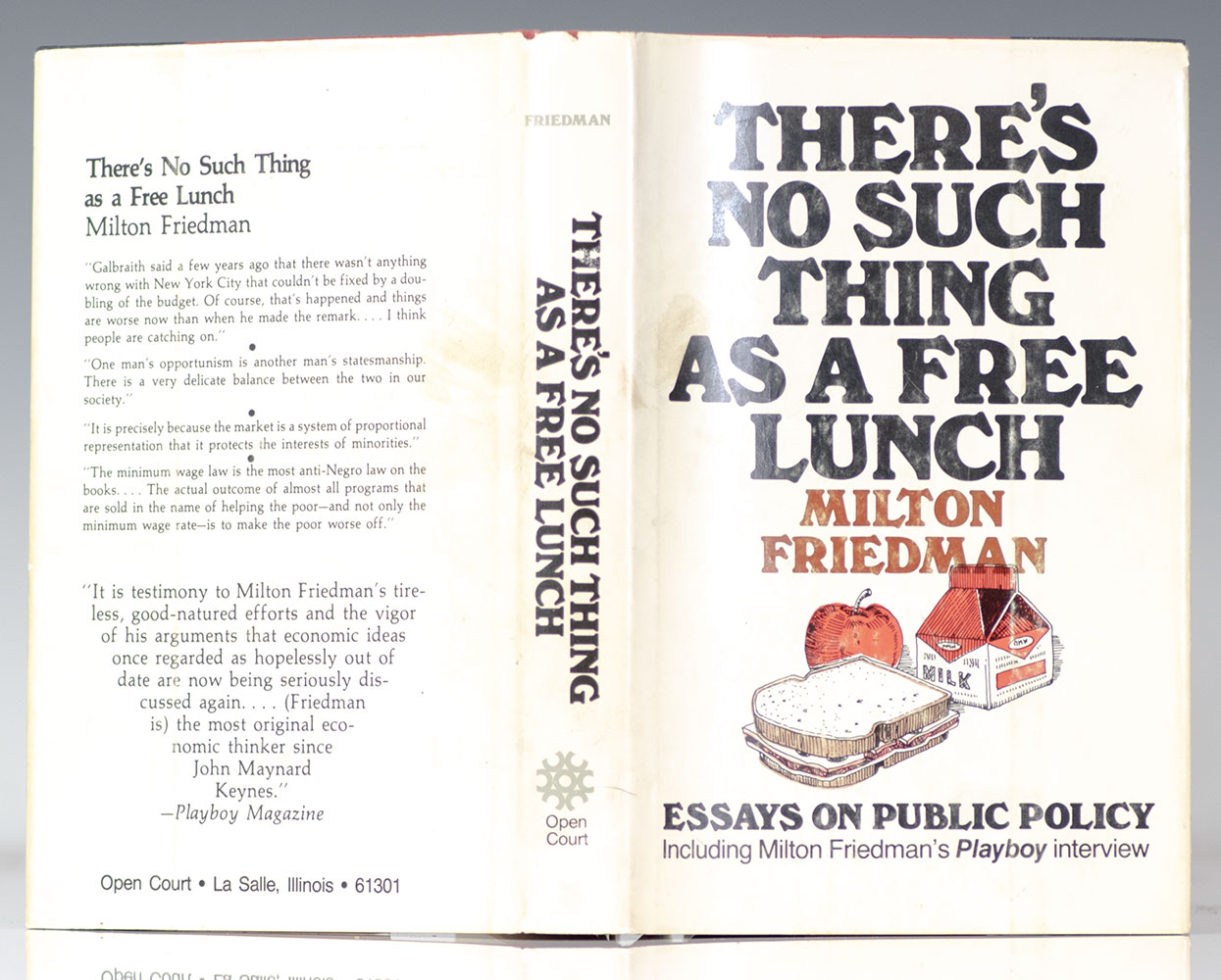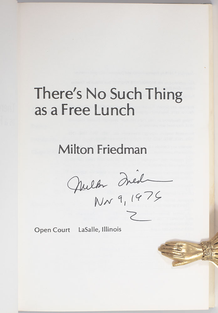 First Edition of Theres No Such Thing As A Free Lunch; Signed by Nobel Prize-Winning Economist Milton Friedman in the year of publication