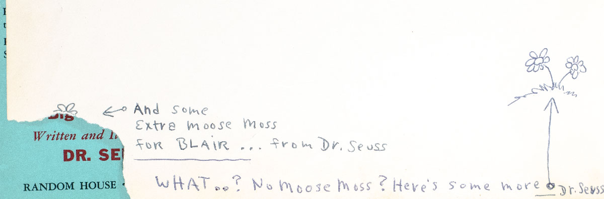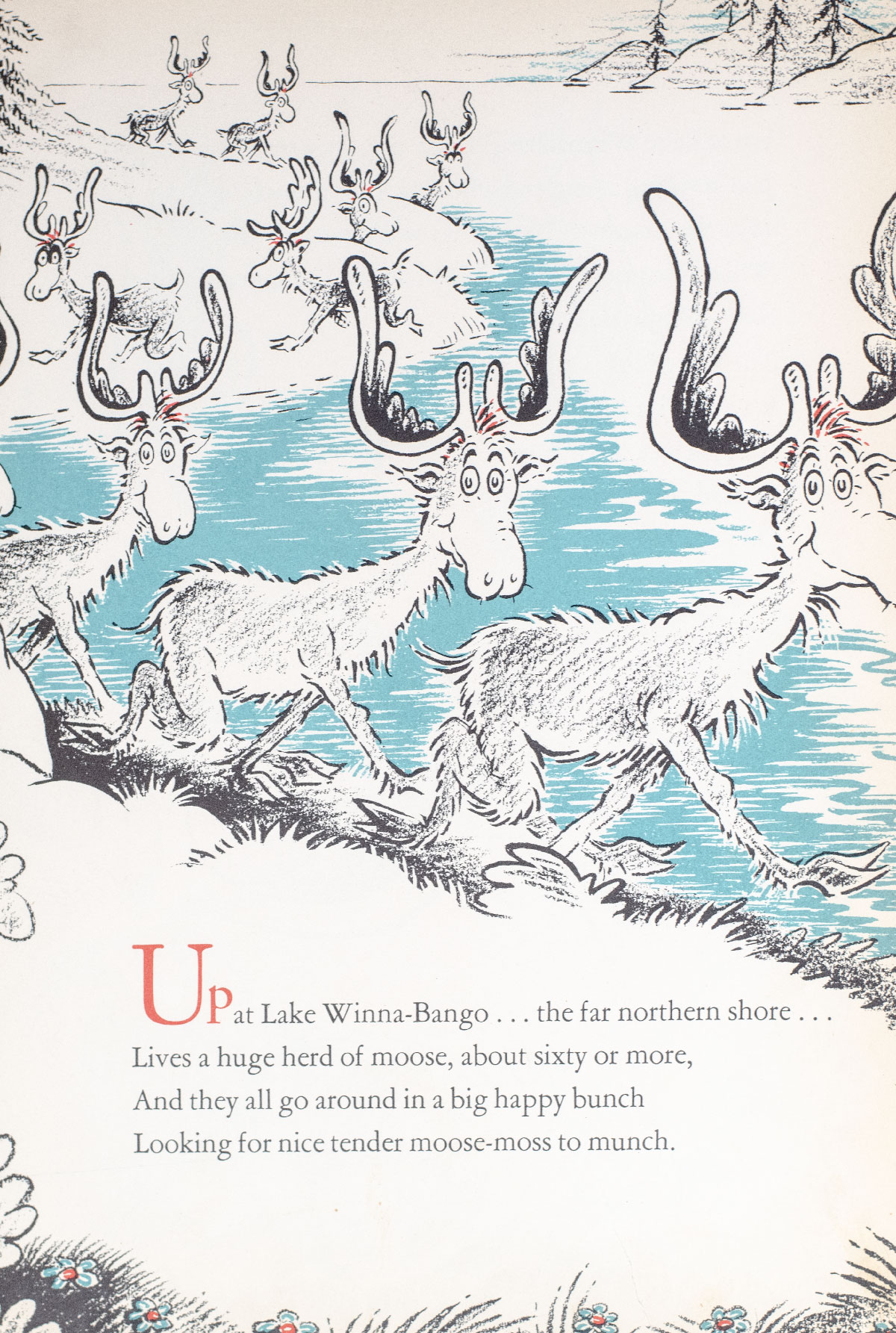 First edition, later printing of one of the more elusive Seuss titles. Quarto, original blue cloth, pictorial endpapers, illustrated by the author. Presentation copy, inscribed by the author on the dedication page, "[Extra Moose Moss for Helen] And some Extra Moose Moss for Blair... from Dr. Seuss WHAT..? No Moose Moss? Here's some more Dr. Seuss." Seuss has added an original drawing of moose moss. Very good in a very good price-clipped second state dust jacket. Loss to the dedication page and inscription. Rare signed and inscribed by Seuss.