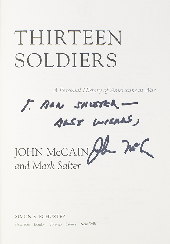 "RARE IS THE SOLDIER WHO IS NOT CHANGED BY WAR"; FIRST EDITION OF JOHN MCCAIN'S Thirteen Soldiers. A Personal History of Americans at War; INSCRIBED BY HIM
