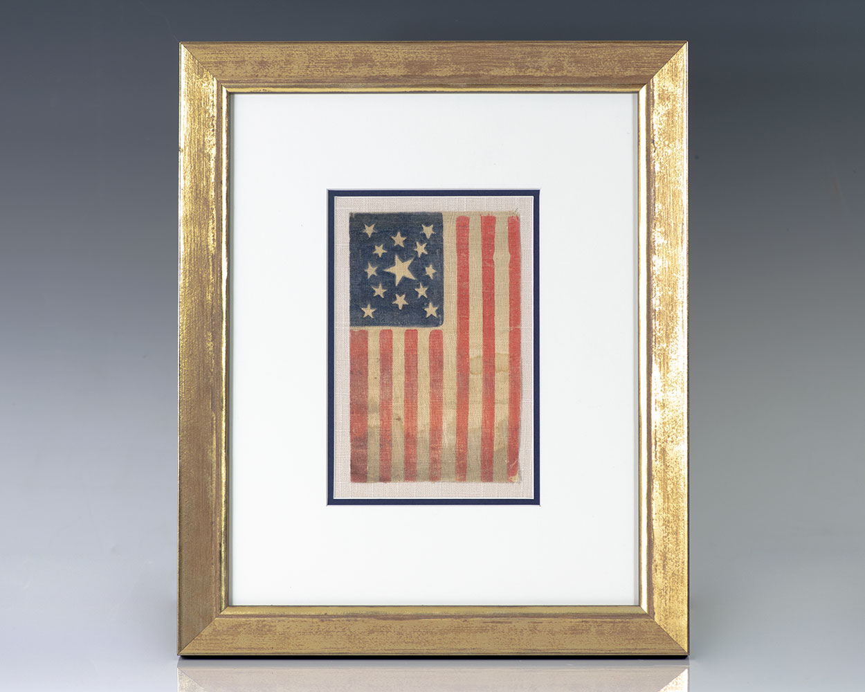 Rare thirteen star American Parade Flag produced during the first Centennial Celebration of American Independence. Printed on glazed cotton, the flag bears thirteen stars arranged in a circular pattern with one large star at center, surrounded by a wreath of 8 stars, and with one star in each of the 4 corners of the canton. In very good condition. The flag measures 7.25 inches by 4.75 inches. Double matted and framed. The entire piece measures 16 inches by 13.75 inches. A rare example showing the variety and originality with which Centennial flags were designed prior to the establishment of federal regulations governing the proportions and star arrangement of of United States flags.