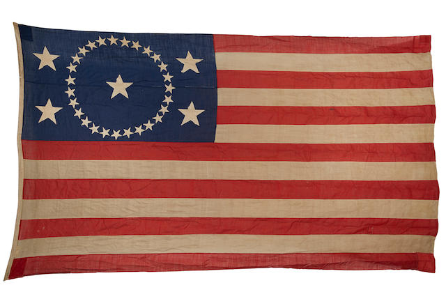 Rare hand-stitched 32-star American flag produced in 1858 with the distinguishing circular star formation in the canton as originally designed by Betsy Ross. The American flag bearing 32 stars was in use between May 11th 1858, when the state of Minnesota was admitted into the Union, and February 14th 1859 when Oregon was admitted as the 33rd state. The entire flag measures 98 inches by 80 inches and, due to its size and date of production, was likely made for use on the main mast of an American vessel, although it was never put to use. In near fine condition. Exceptionally rare and desirable.