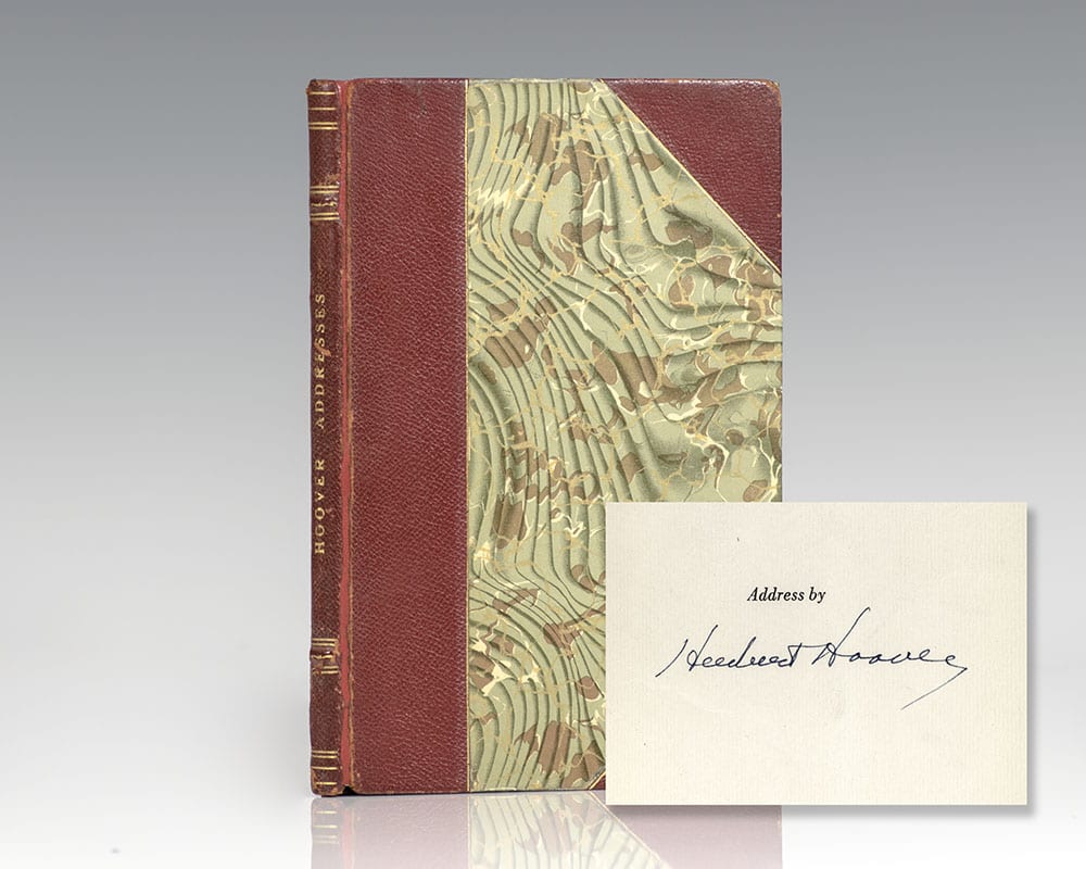 First edition of President Herbert Hoover's 1948 Address before the Republican National Convention. Octavo, bound in three quarters morocco over marbled boards, gilt titles and tooling to the spine, raised bands, marbled endpapers. Signed by Herbert Hoover on the title page. Also bound in are two letters signed by Hoover on his letterhead in facsimile with two copies of The Meaning America, the Homecoming Address delivered by Hoover on his 74th Birthday, August 10, 1948. In very good condition with light rubbing to the extremities.