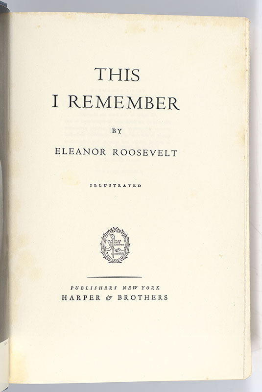 First edition, early printing of Eleanor Roosevelt’s wonderful autobiography. Octavo, original blue cloth. Illustrated with 41 photographs of the Roosevelt family, including frontispiece of the First Lady. Boldly signed by Eleanor Roosevelt on the half-title page. Near fine in a near fine dust jacket.
