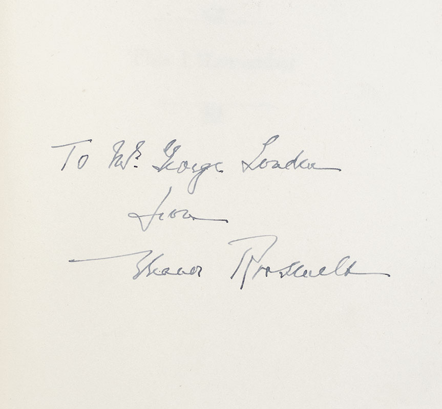 First edition of Eleanor Roosevelt’s wonderful autobiography. Octavo, original blue cloth, illustrated with 41 photographs of the Roosevelt family, including frontispiece of the First Lady. Presentation copy, inscribed by the author on the front free endpaper, "To Mr. George London from Eleanor Roosevelt." The recipient George London was a concert and operatic bass-baritone. After performing widely with tenor Mario Lanza and soprano Frances Yeend as part of the Bel Canto Trio in 1947–48, London was engaged by the Vienna State Opera, where he scored his first major success in 1949. In 1950, he sang the role of Pater Profundis in Mahler's Eighth Symphony, conducted by Leopold Stokowski. Near fine in a near fine dust jacket.