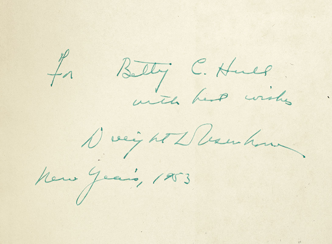 First edition of this detailed photobiography of Dwight "Ike" Eisenhower. Quarto, original cloth, illustrated with over 250 photographs. Presentation copy, inscribed by Dwight D. Eisenhower on the front free endpaper in the month of his inauguration of 1953, "for Betty C. Hull with best wishes Dwight D. Eisenhower New Years', 1953." Near fine in a good dust jacket. Rare and desirable signed by President Eisenhower.