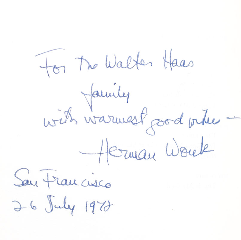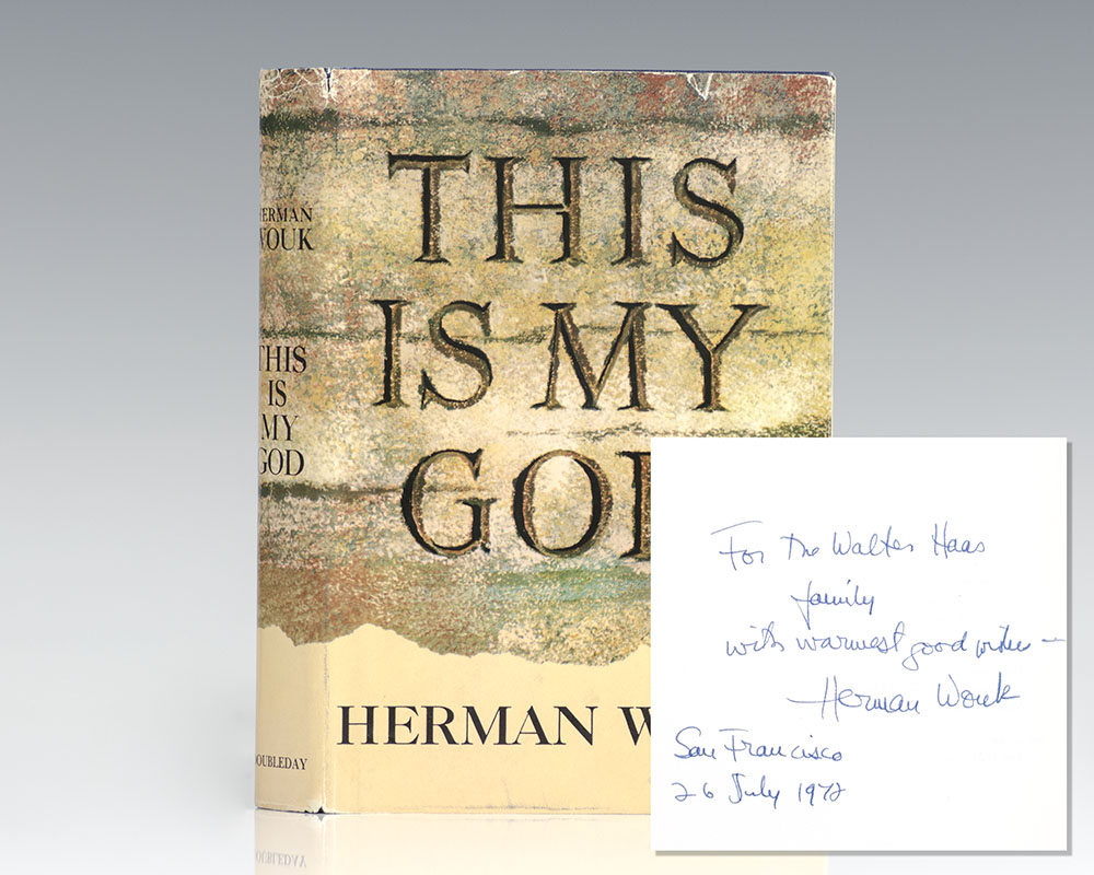 First edition of Wouk's classic introduction to Judaism. Octavo, original cloth. Presentation copy, inscribed by the author on the title page, "For the Walter Haas Family with warmest best wishes Herman Wouk San Francisco 26 July 1972." Walter A. Haas was a former President and Chairman of Levi Strauss & Co., he was also President of the San Francisco Jewish Welfare Federation. Fine in a near fine price-clipped dust jacket. Jacket design by Robert Galster.