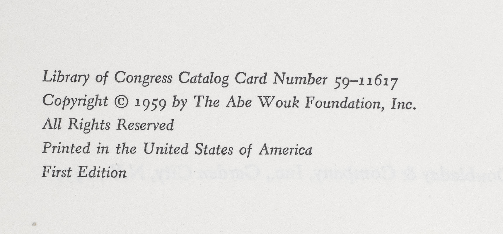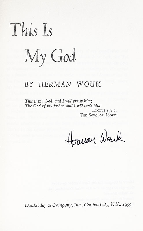First edition of Wouk's classic introduction to Judaism. Octavo, original cloth. Boldly signed by Herman Wouk on the title page. Fine in a near fine dust jacket with light rubbing. Jacket design by Robert Galster.