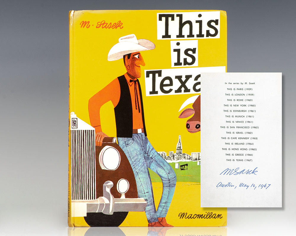 First edition of this work on the state of Texas in the classic Sasek This is series. Quarto, original illustrated boards, illustrated throughout. Boldly signed by the author in the year of publication, "M. Sasek Austin, May 10, 1967." In near fine condition.