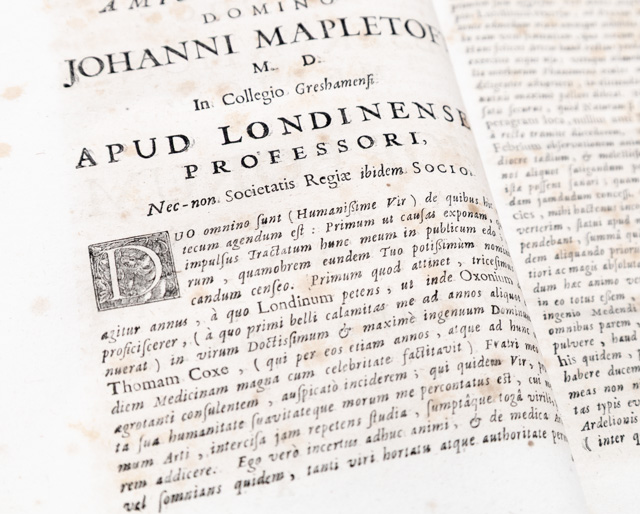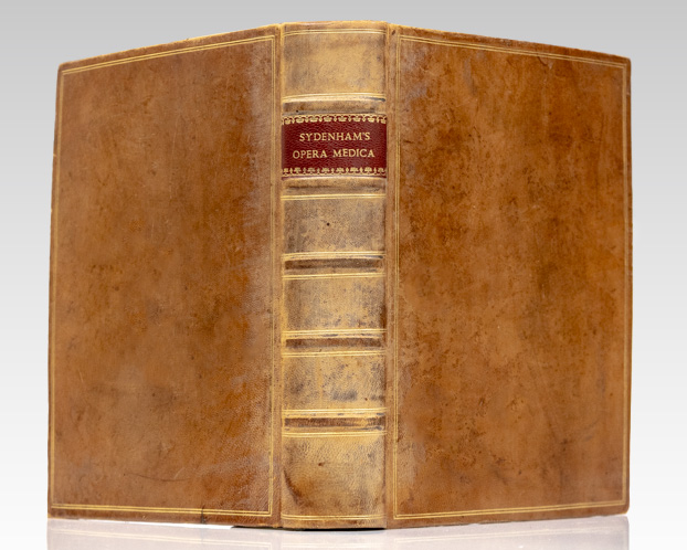 The collected medical works of Thomas Sydenham. Royal octavo, written in Latin, volume one only, bound in full calf with gilt titles and ruling to the spine in six compartments within raised bands, morocco spine label, double gilt ruling to the front and rear panels, all edges stained red, engraved frontispiece of Thomas Sydenham, illustrated. In very good condition.