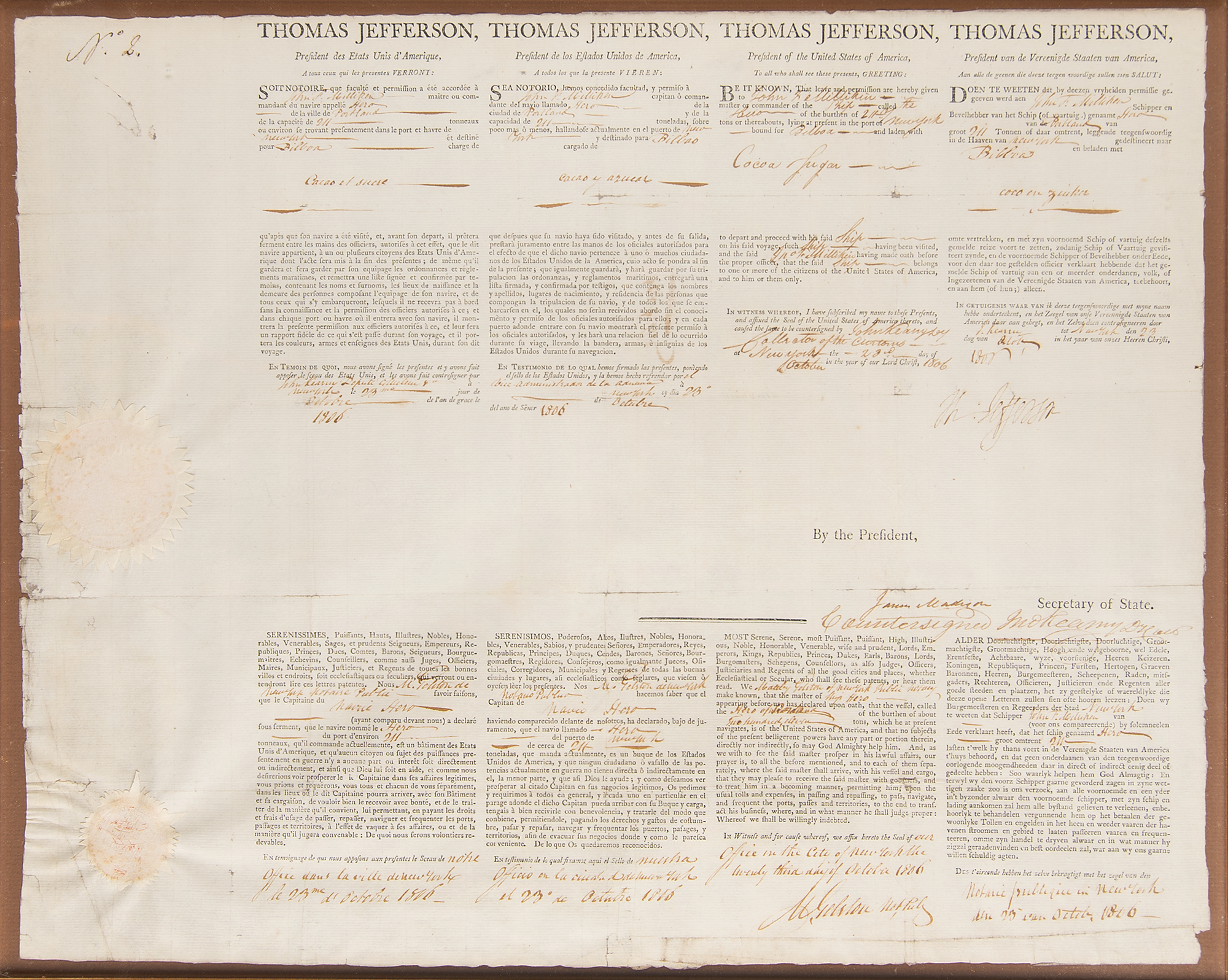 Rare four-language ship's passport signed by Thomas Jefferson as President and James Madison as Secretary of State. One page, partially printed and accomplished in manuscript, dated September 10, 1802. The passport contains four columns, one in English and three translations in French, Spanish, and Dutch, and gives leave and permission to "John H. Milliken, master or commander of the Ship called the Hero... lying at present in the port of New York, bound for Bilboa and laden with Cocoa & Sugar." Neatly signed at the center in ink by President Thomas Jefferson and countersigned below by Secretary of State James Madison. The original white paper seals remain affixed to the left side. Matted and framed with black and white portraits of Jefferson and Madison. The passport measures 20.75 inches by 16.75 inches. The entire piece measures 29.5 inches by 39 inches. A very rare large format document boasting a highly desirable combination of presidential autographs.