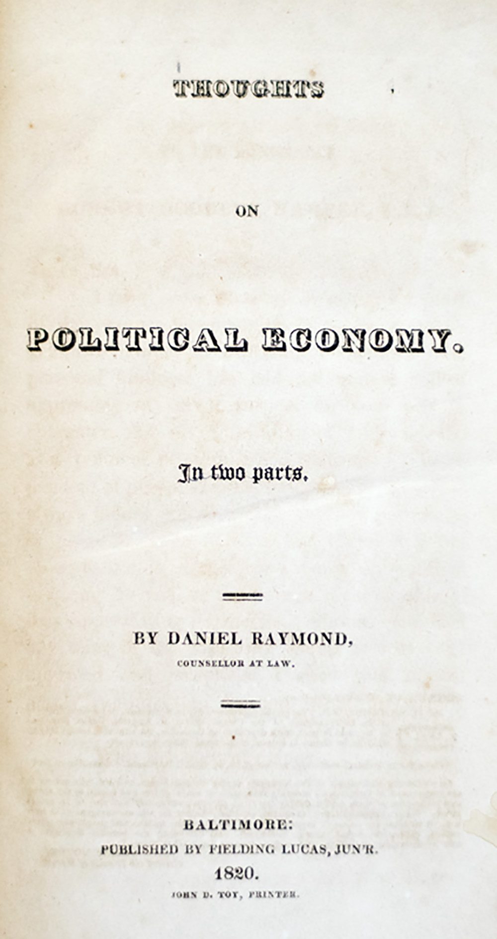 Daniel Raymond was the first important political economist to appear in the United States. He theorized that "labor creates wealth" which may have been an improvement based on the thinking of Adam Smith of Europe. Daniel Raymond thought that the economy of England was actually the economy of the higher-ranking members of that society, and not the economy of the entire nation. He held that wealth is not an aggregation of exchange values, as Adam Smith had conceived it. Daniel Raymond held that wealth is the capacity or opportunity to acquire the necessaries and conveniences of life by labor. "Thoughts on Political Economy is the first systematic work on this subject by an American"--Howes R82 ("aa"). Sabin 68042.