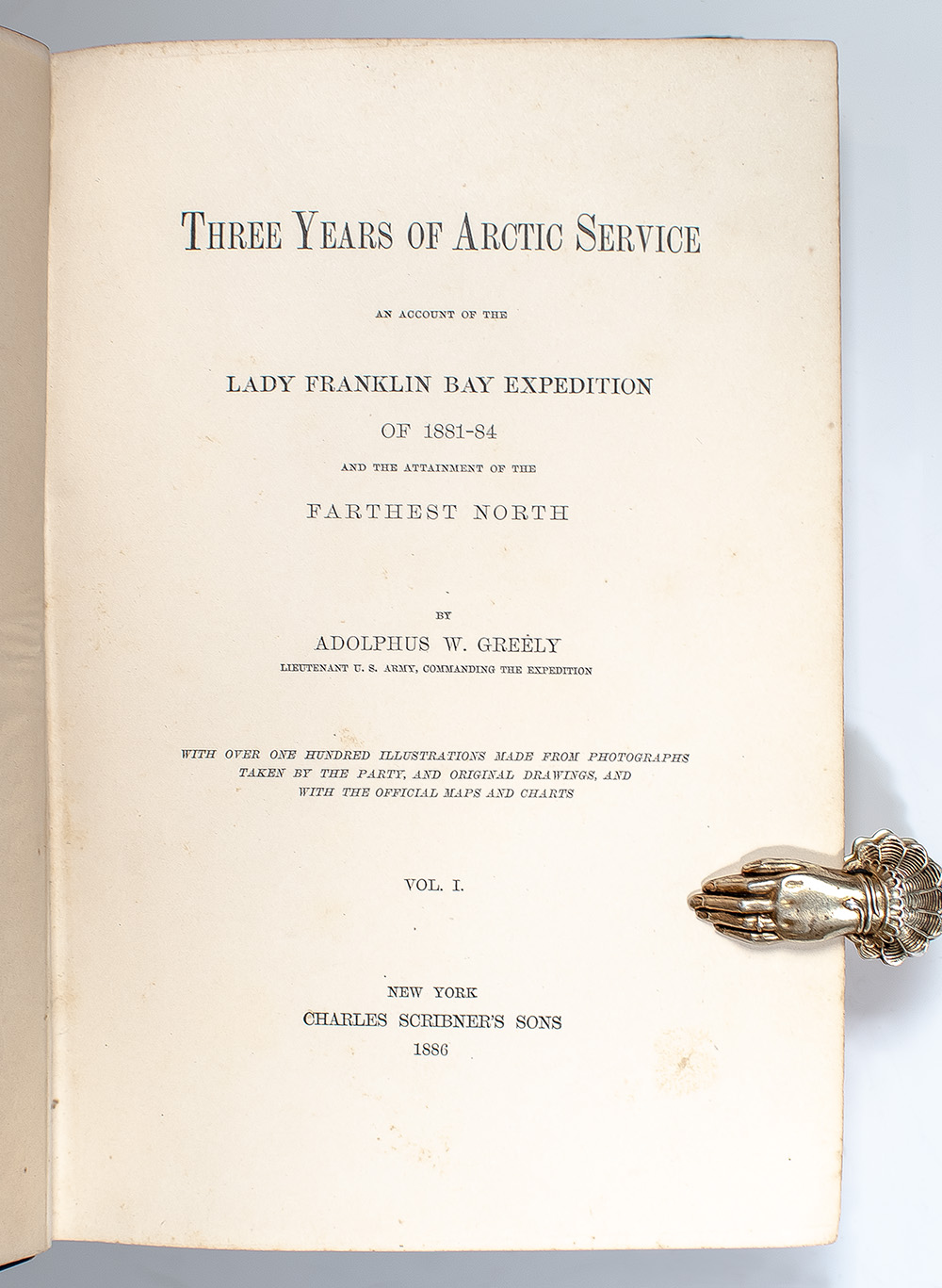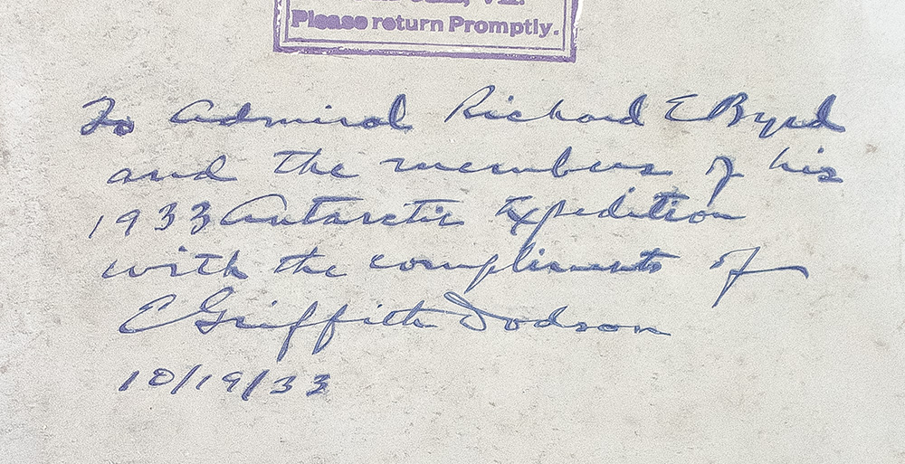 "To Admiral Richard E. Byrd and the remembrance of his 1933 Antarctic Expedition": First Edition of Adolphus W. Greely's Three Years of Arctic Service; Inscribed by E. Griffith Dodson to Polar Explorer Admiral Richard E. Byrd