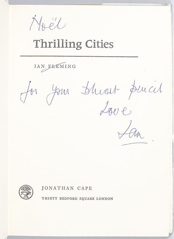 “SERVE ON HOT BUTTERED TOAST… WITH PINK CHAMPAGNE”: FIRST EDITION OF IAN FLEMING’S THRILLING CITIES; inscribed by him to close personal friend and neighbor Noel Coward