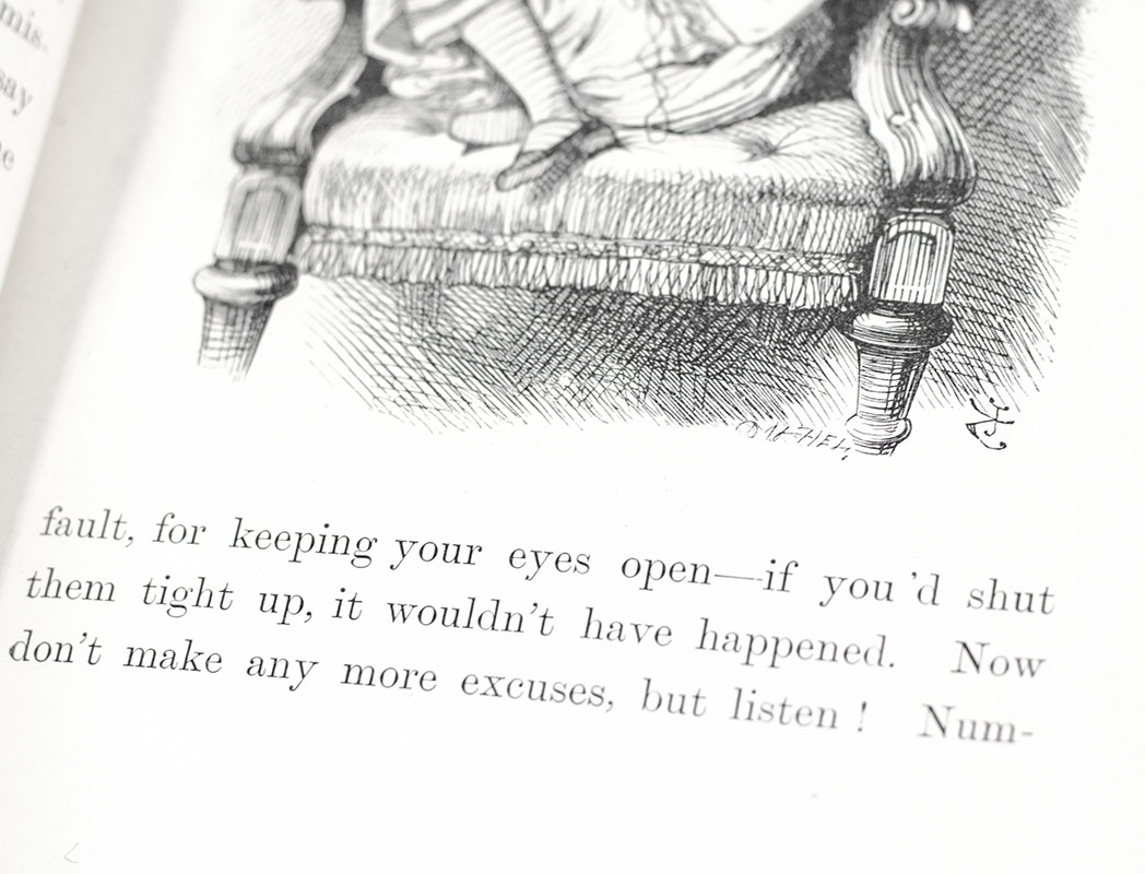 Finely bound example of the author's classic work. Octavo, elaborately bound in full crimson morocco by Bayntun with morocco spine labels lettered in gilt, elaborate gilt tooling to the spine in six compartments within raised gilt bands, gilt ruling to the panels, gilt turn-ins and inner dentelles, marbled endpapers, all edges gilt and two ribbons bound in. With fifty illustrations by John Tenniel and the original cloth bound in at rear. In near fine condition.