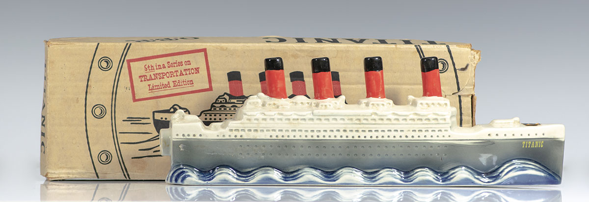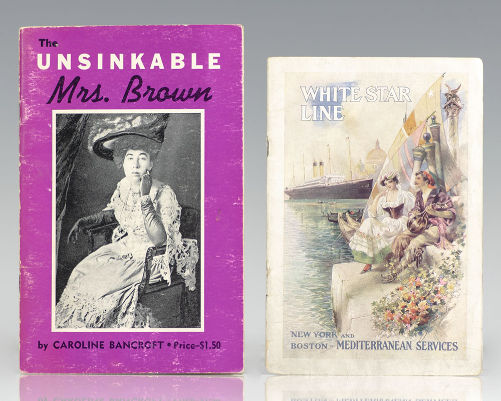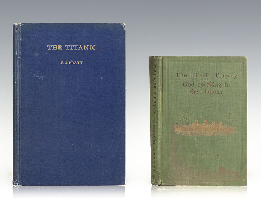 Rare collection of first editions, pamphlets, and sheet music related to the sinking of the RMS Titanic, with a rare limited edition O.B.R. Kentucky Straight Bourbon 86-proof Whiskey 4/5 quart ceramic Titanic replica. The collections includes a first edition of E.J. Pratt's 'The Titanic' (Toronto: The Macmillan Co. of Canada, 1935) which is in near fine condition; a first edition of Mrs. Alma White's 'The Titanic Tragedy- God Speaking to the Nations' (New Jersey: The Pentecostal Union, 1913) which is in near fine condition; a later printing booklet of Caroline Bancroft's 'The Unsinkable Mrs. Brown' (Boulder: Johnson Publishing Co., 1963); three sheet music folios including Will Kirkpatrick and M.C. Hanford's 'The Wreck of the Titanic' (Washington, D.C.: H. Kirkus Dugdale Co., 1912), Mrs. William Euler and Jack Stanley's 'Wreck of Titanic Song' (Washington, D.C.: H. Kirkus Dugdale Co., 1912), and Paul Pelham and Lawrence Wright's 'Be British! Descriptive Song and Recitation Dedicated to the Gallant Ill-Fated Crew of the Titanic' (London: Lawrence Wright Music Co, 1912); a rare printing of John J. Friend's 'The Loss of the Steamship Titanic: In Loving Remembrance of Those Who Lost Their Lives On Board the Steamship Titanic'; an original 1911 White Star First Class Passenger Ship per the S.S. Romanic which departed from Boston for Genoa on Saturday, April 20, 1911; and a rare limited edition O.B.R. Kentucky Straight Bourbon 86-proof Whiskey 4/5 quart ceramic Titanic replica which measures 17 inches in height and is housed in the original illustrated cardboard clamshell box. An exceptional collection of works, many produced in the same year of the fateful tragedy.