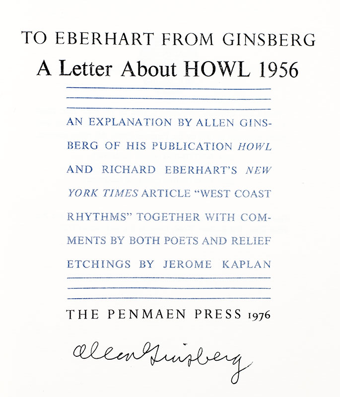 "The most remarkable poem of the young group, written during the past year, is Howl": First Signed limited edition of To Eberhart From Ginsberg; signed by Allen Ginsberg and inscribed by Richard Eberhart