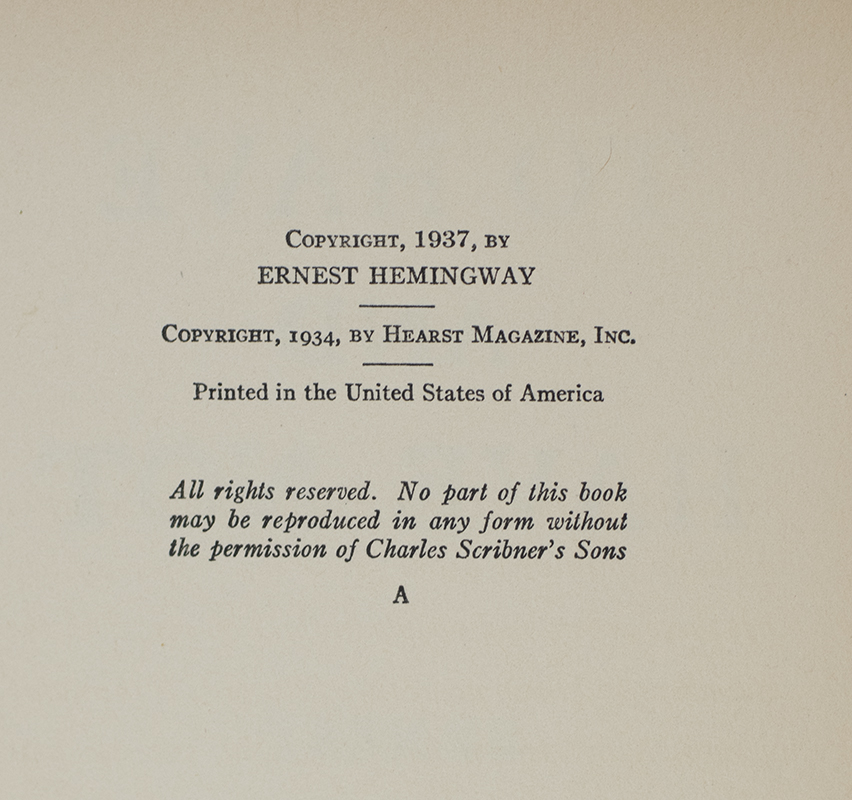 First edition of Hemingway's classic novel about smuggling, intrigue, and love. Octavo, bound in full morocco by the Harcourt Bindery, gilt titles and ruling to the spine, raised bands, gilt ruled to the front and rear panels, gilt signature to the front panel, marbled endpapers, all edges gilt. In fine condition.