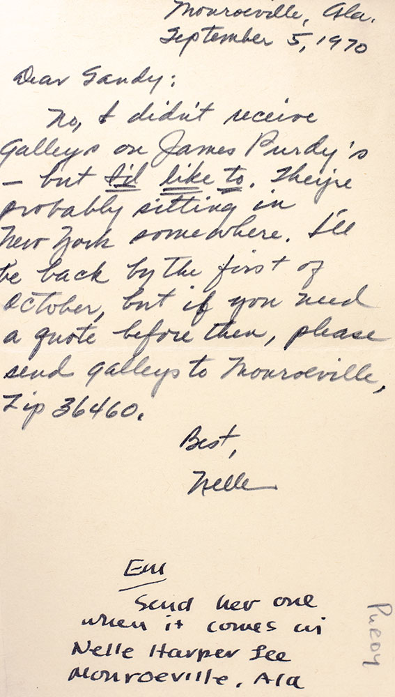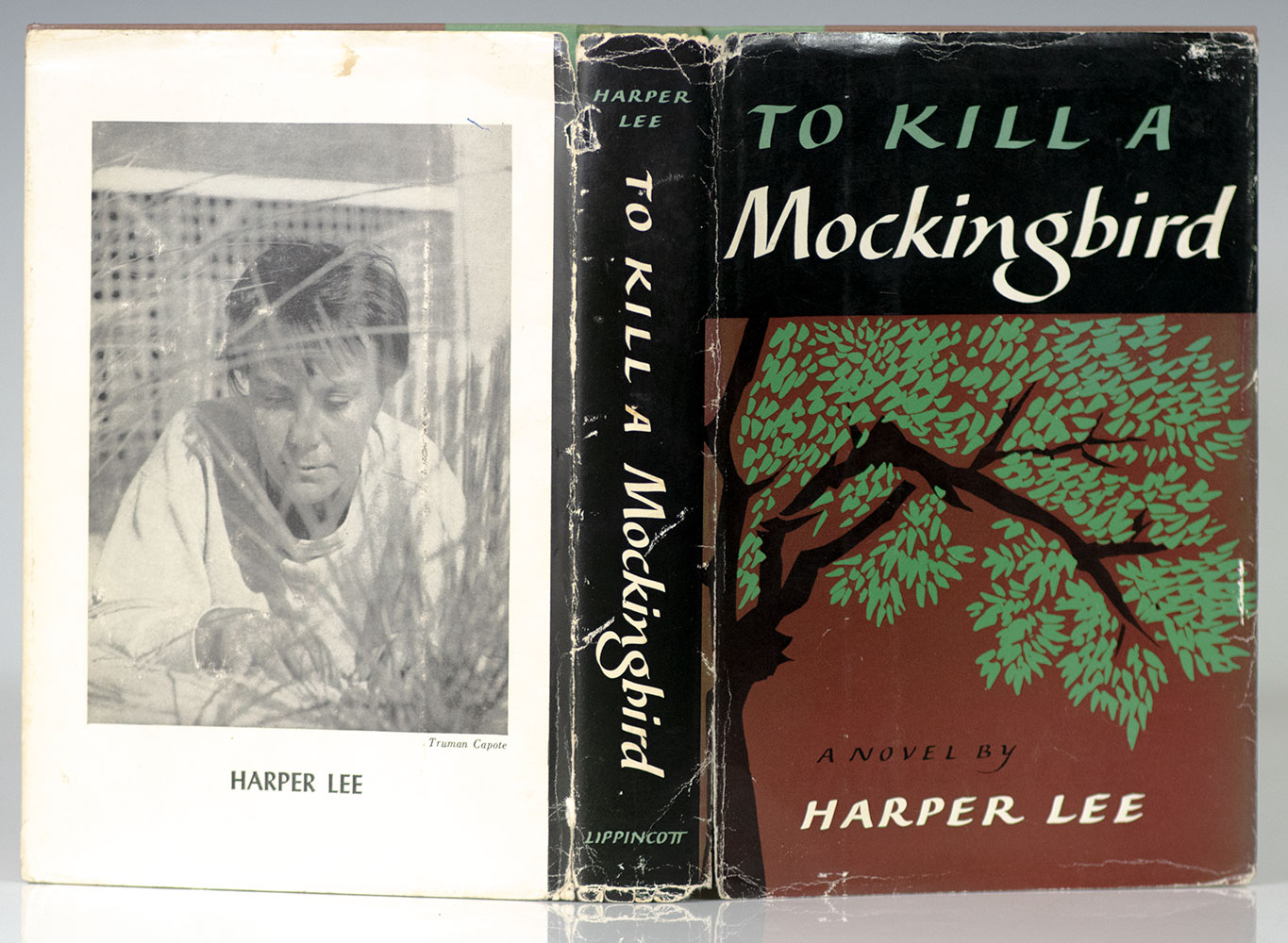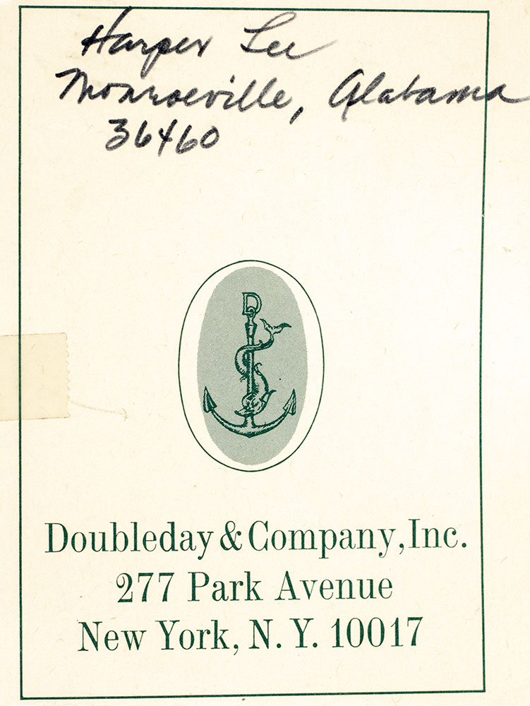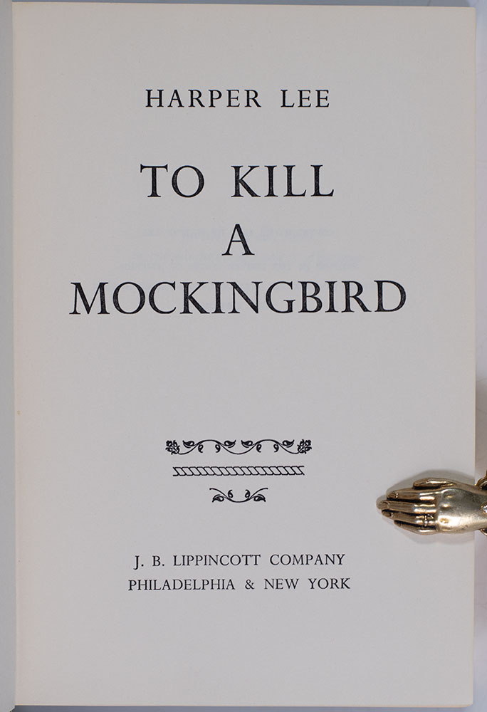 First edition of one of the most important American novels of the 20th century which had an initial first printing of 5,000 copies and went on to earn Harper Lee the 1961 Pulitzer Prize for fiction. Octavo, original half cloth. With an autograph postcard signed by and entirely in the hand of Harper Lee laid in. Addressed to Stewart Richardson, Executive Editor of Doubleday & Company, the postcard reads in full, "Monroeville, Ala. September 5, 1970 Dear Sandy: No, I didn't receive galleys on James Purdy's - but I'd like to. They're probably sitting in New York somewhere. I'll be back by the first of October, but if you need a quote before then, please send galleys to Monroeville, zip 36460. Best, Nelle." Following the publication of To Kill a Mockingbird in 1960, Lee became increasingly reclusive, granting almost no requests for interviews or public appearances and, with the exception of a few short essays, publishing nothing further until 2015. 40 years, she lived part-time at 433 East 82nd Street in Manhattan, near her childhood friend Truman Capote, but tensions grew between them with the publication of Capote's In Cold Blood and his growing penchant for a decadent lifestyle, which contrasted with Lee's preference for a quiet, more anonymous existence. At the time of this correspondence with Doubleday, Lee had begun to spend more time in Monroeville, where she had assumed significant care responsibilities for her aging father. Near fine in a very good dust jacket. Jacket design by Shirley Smith. Author photograph by Truman Capote. Housed in a custom half morocco clamshell box made by the Harcourt Bindery.