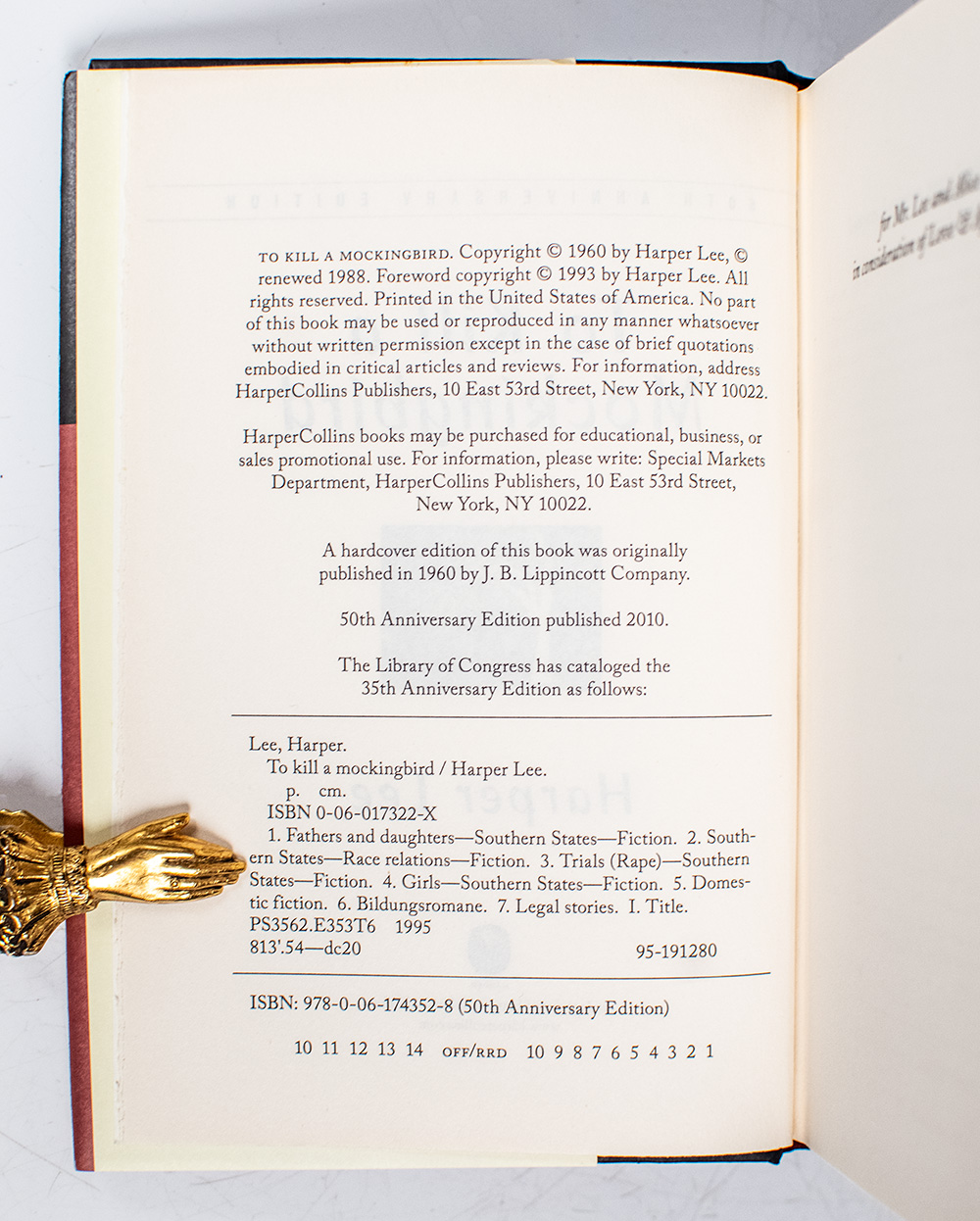 "Shoot all the bluejays you want, if you can hit 'em, but remember it's a sin to kill a mockingbird": First Edition of the 50th Anniversary Edition of To Kill A Mockingbird; Inscribed by Harper Lee