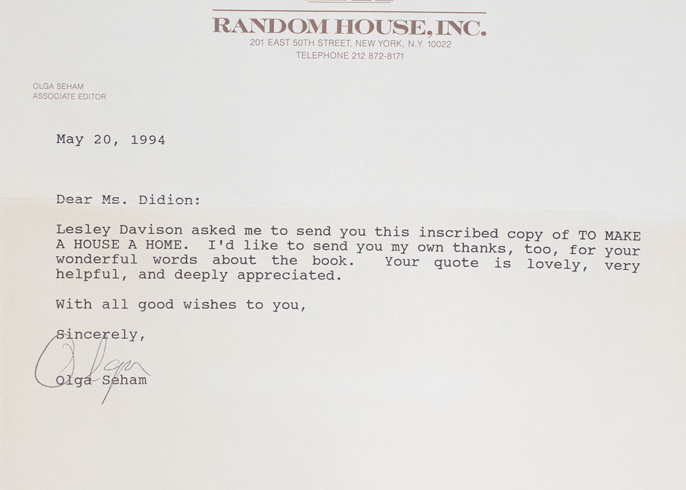 First edition of Jane and Lesley Davison's To Make a House a Home; inscribed by Lesley Davison to Joan Didion