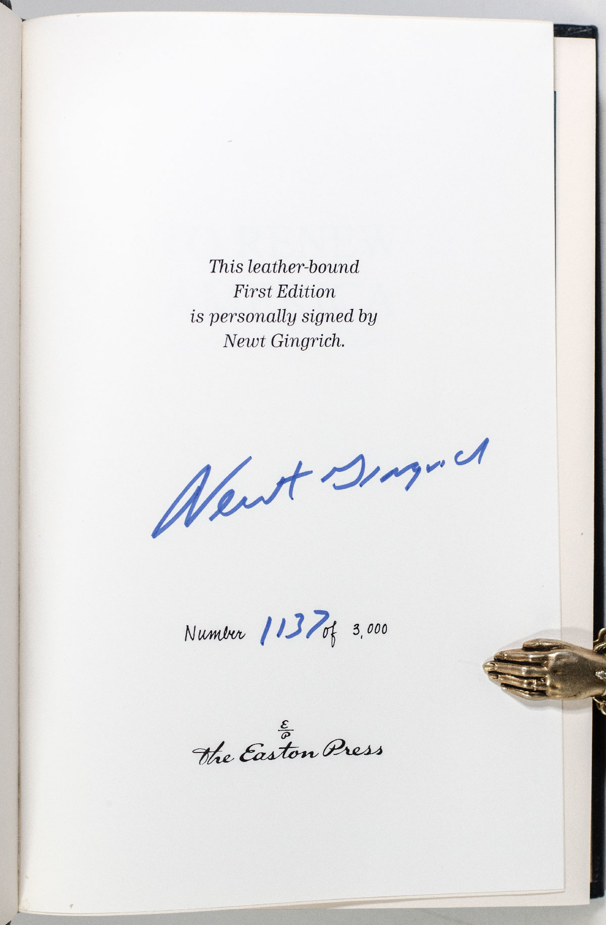Signed limited edition of the former Speaker of the House's work. Octavo, bound in full leather, gilt titles and tooling to the spine, front and rear panels, all edges gilt, silk endpapers. In near fine condition.